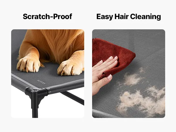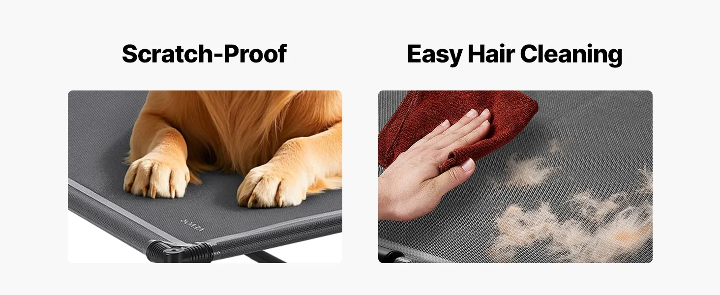 • Breathable Mesh Fabric: High-quality mesh ensures constant airflow, keeping your pet cool and comfortable while resting. Sensitive areas like the belly and underarms stay fresh. With waterproof and oil-resistant features, cleaning is hassle-free. The elevated dog bed is machine washable, avoiding hair buildup, promoting your pet’s skin health and making maintenance easier