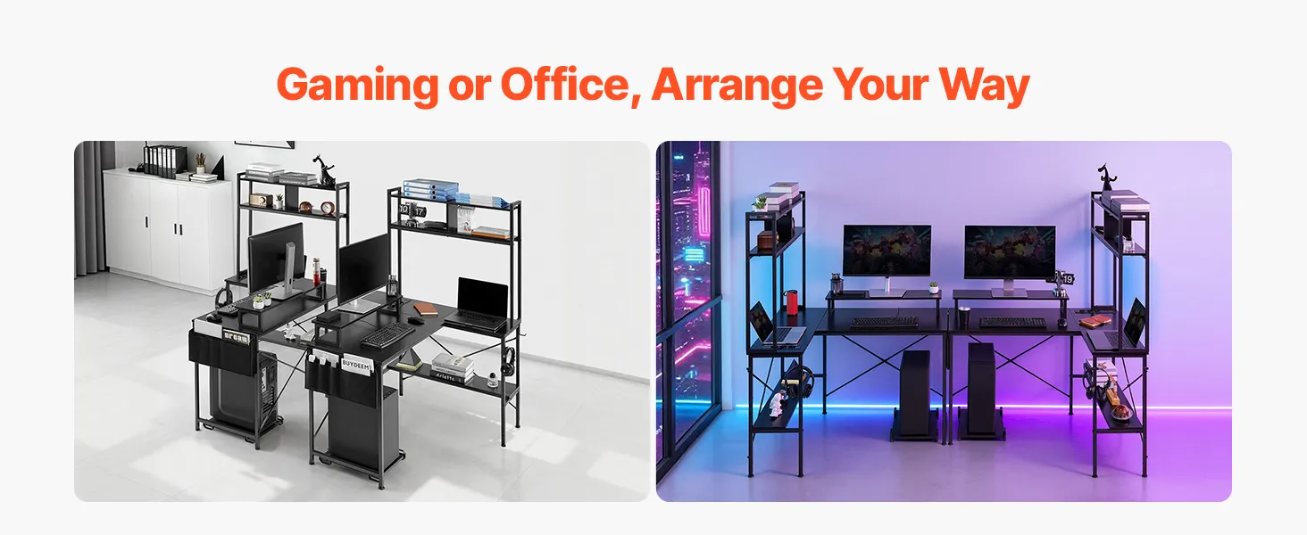 • Reversible L-Shaped Desk: Maximize your corner space with VEVOR reversible L-shaped gaming desk. Featuring 2 assembly options, it easily adapts to different room layouts and works perfectly as a gaming desk, computer desk, or home office workstation