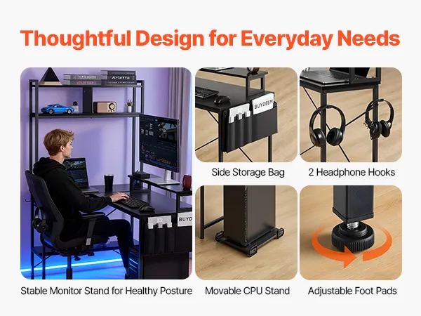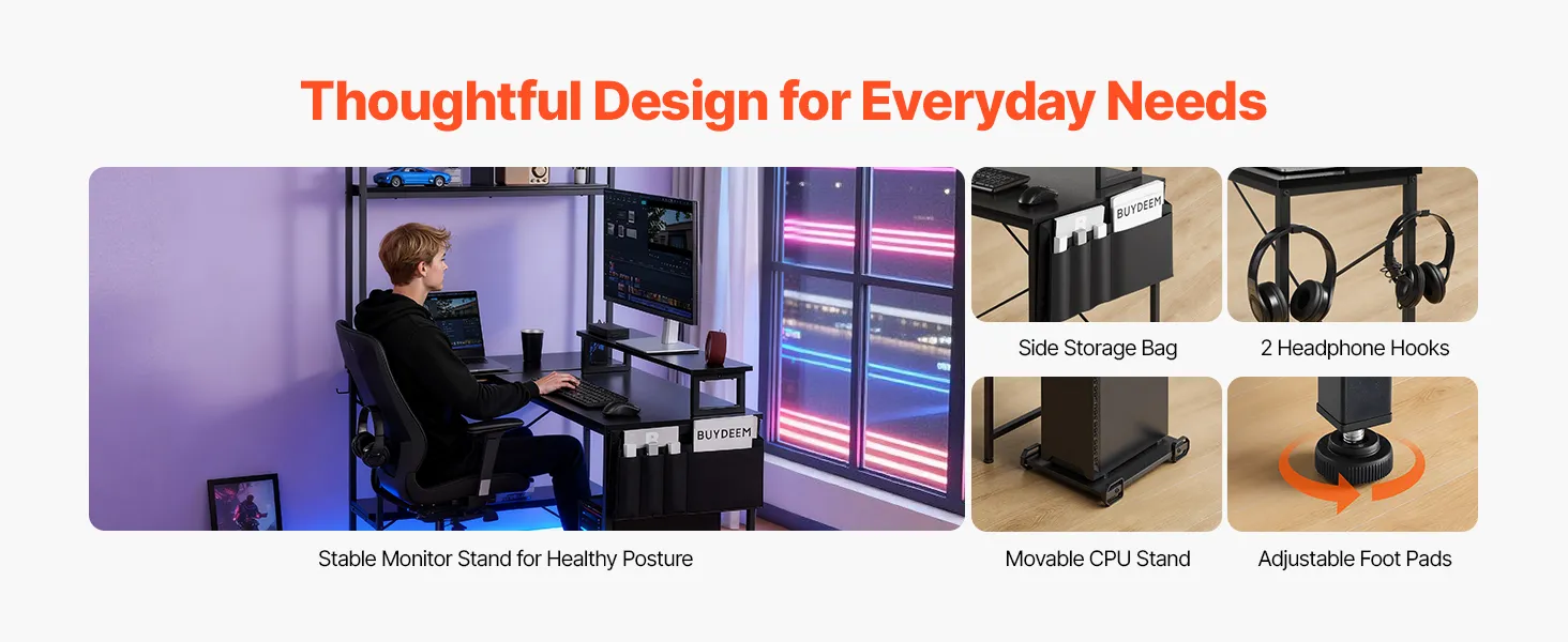 • More Thoughtful Designs: The movable CPU stand allows flexible tower placement, while the monitor stand improves viewing comfort and frees up desk space to keep your workspace neat. A modern PC desk enhances your space with both style and functionality