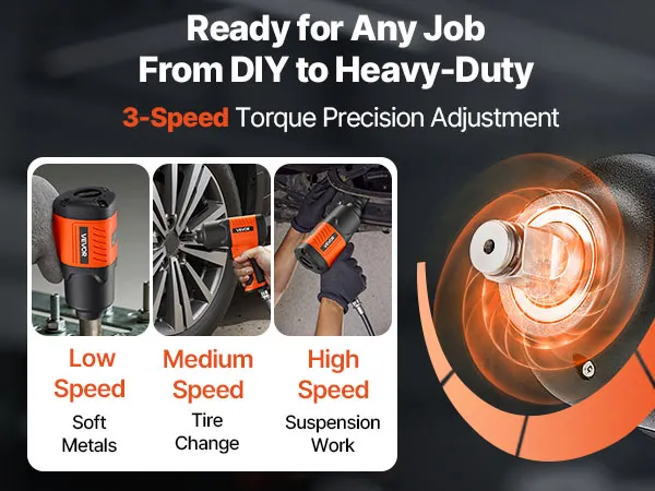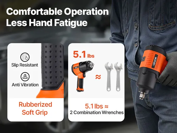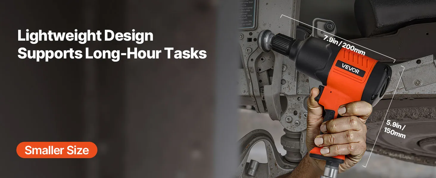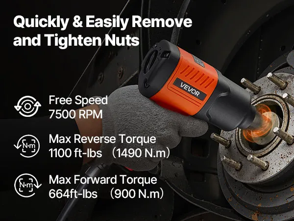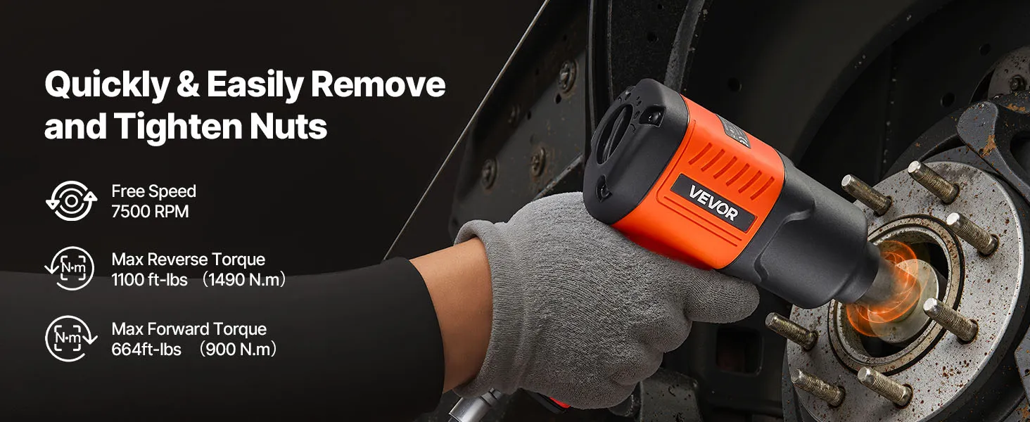 This 1/2" air impact wrench delivers up to 1100 ft-lbs (1490N.m) high reverse torque and 7500RPM free speed. It easily loosens bolts and nuts, ideal for light duty auto repair, maintenance, and various assembly and disassembly tasks. A reliable choice for home garages and auto repair shops.