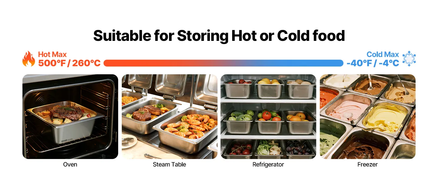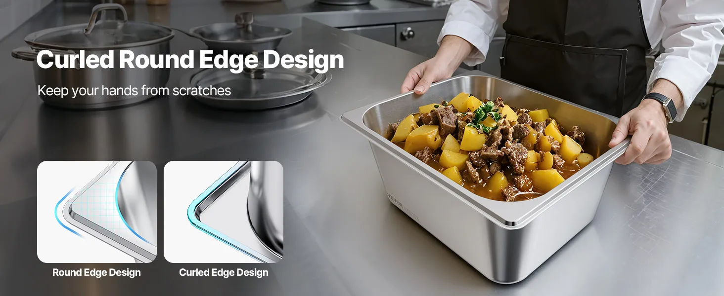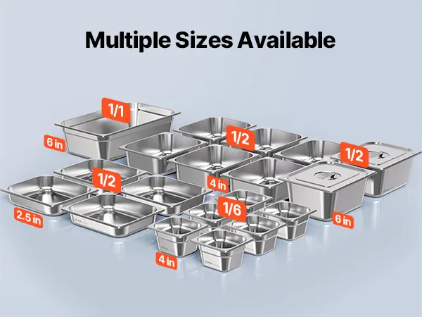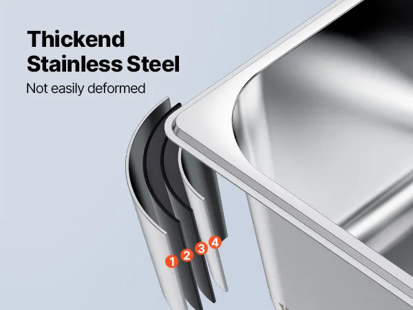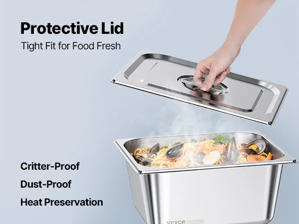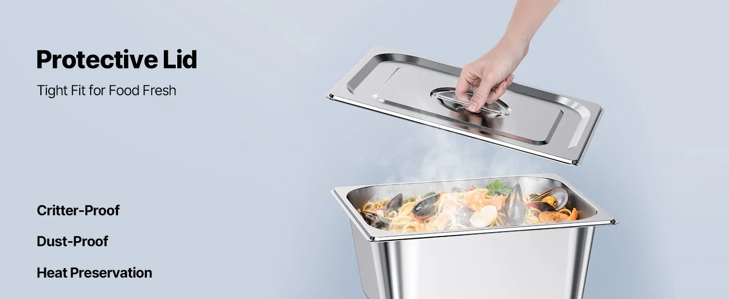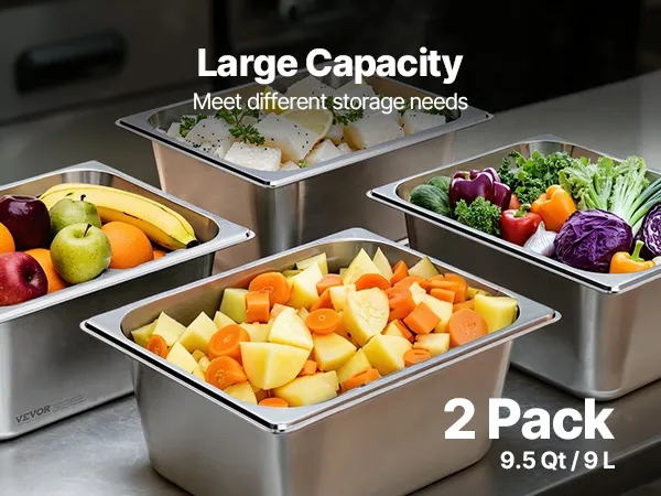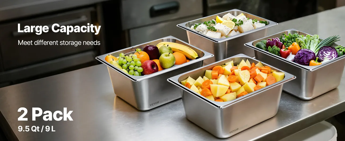 This steam tray is made from commercial-grade 22-gauge SS201 stainless steel, offering strength and rust resistance. The 1/2 half-size pan, 6 inches deep, 2-pack with lids design meets daily cooking needs and is perfect for cooking, storing, and displaying food such as meats, vegetables, fruits, and even ice cream.