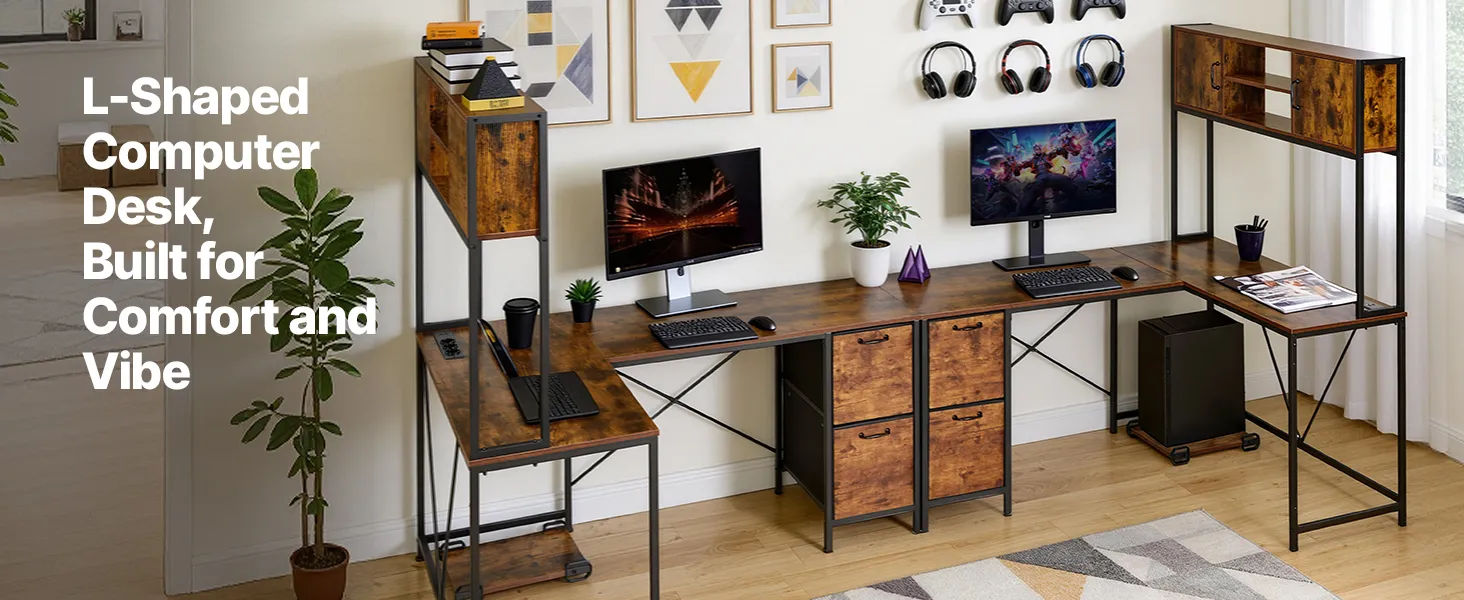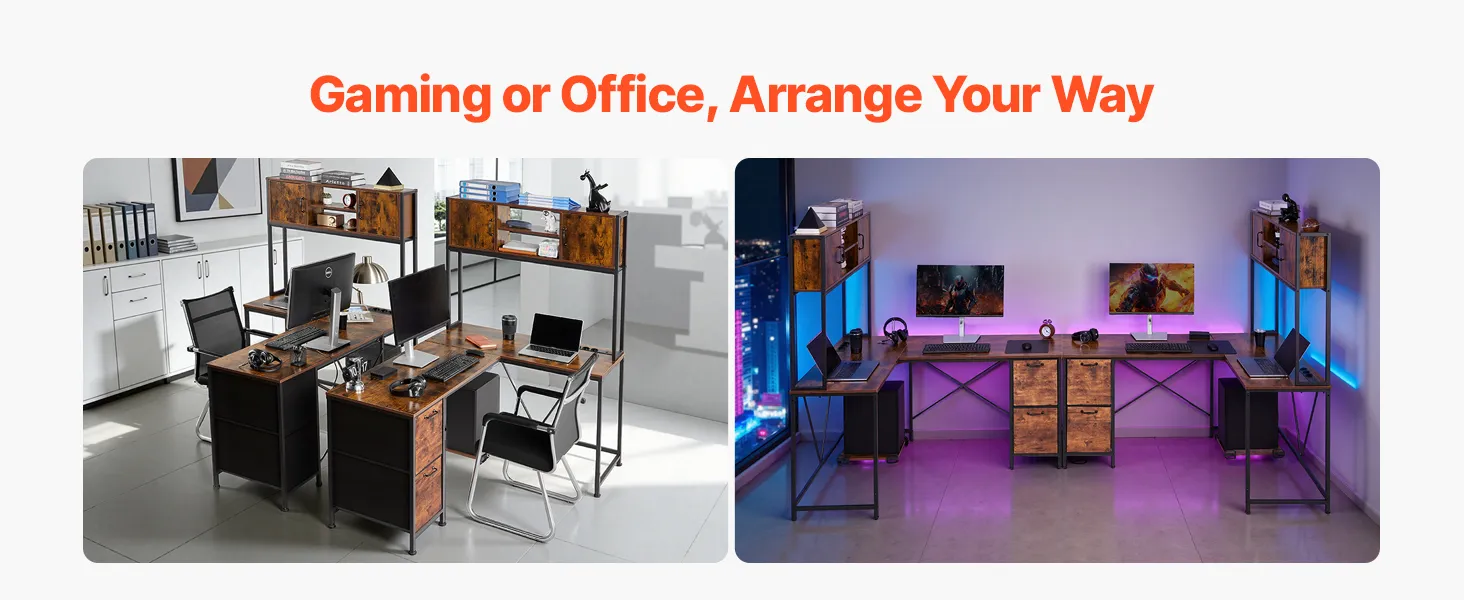 Enhance your gaming or work experience with this VEVOR L-shaped gaming desk, featuring a reversible design with 4 assembly options, a colorful RGB light strip, a built-in power outlet, and spacious storage space to keep your setup organized and efficient.
