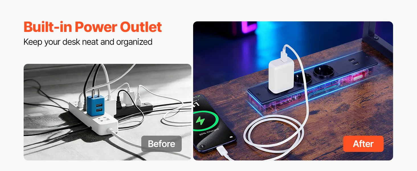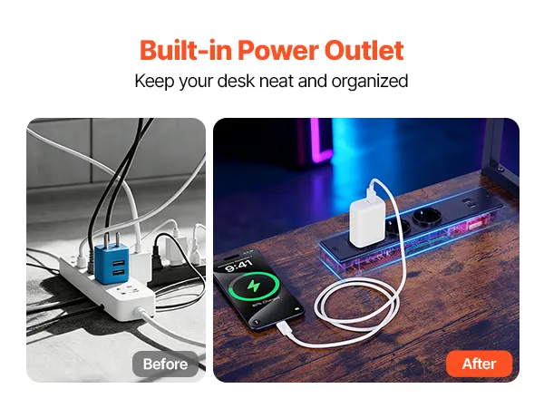 Charge devices directly at your desk with the built-in power outlet, keeping cables organized and your workspace tidy.