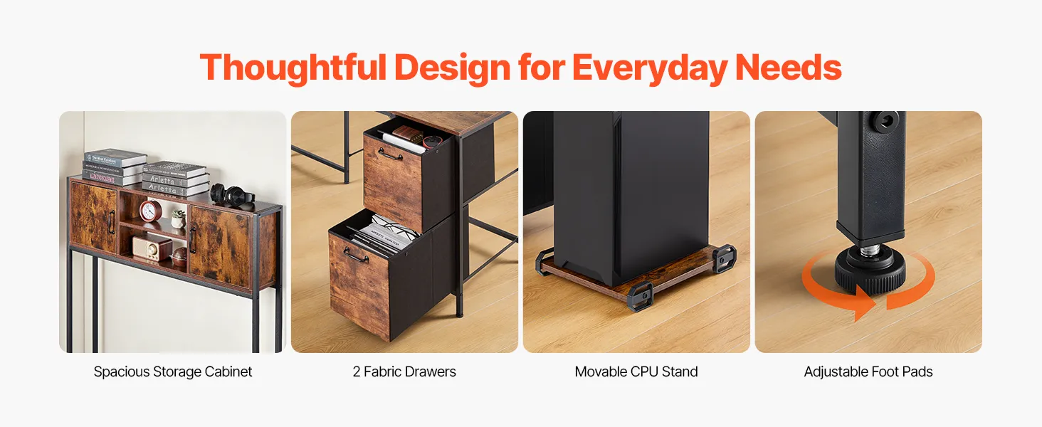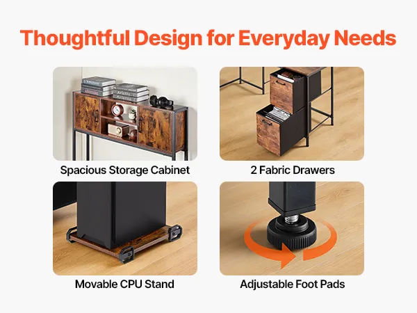 Two cabinets and fabric drawers provide flexible storage, keeping essentials organized and within easy reach, while the movable CPU stand keeps your computer tower off the floor and conveniently accessible.