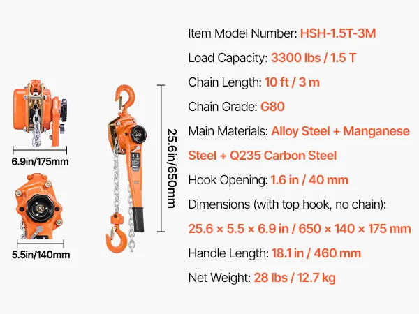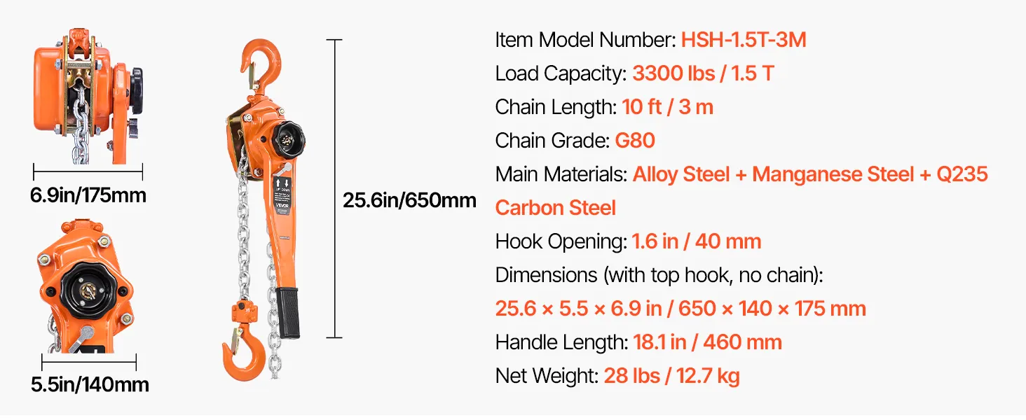 VEVOR Manual Lever Chain Hoist, 1-1/2T 1500KG Capacity Heavy Duty Come Along, 3M Lift G80 Alloy Steel Chain With Dual Pawl Mechanical Brake, 360° Rotating Hooks, for Warehouse Construction Garage