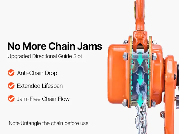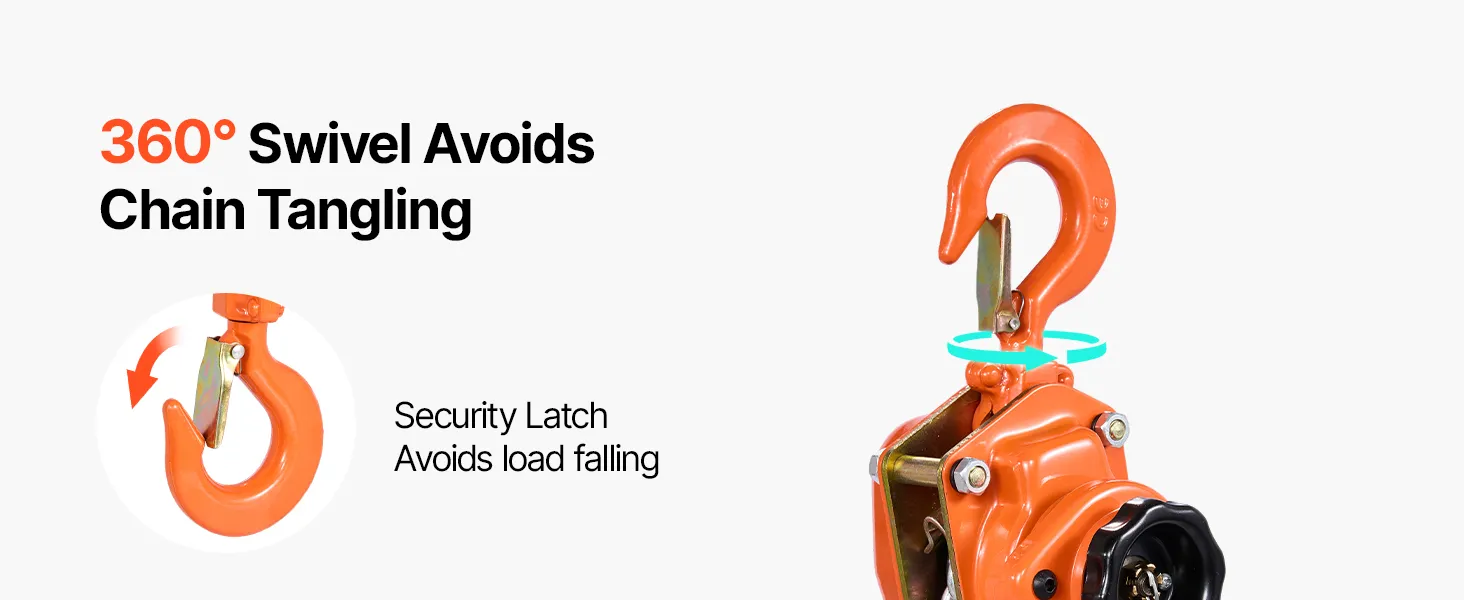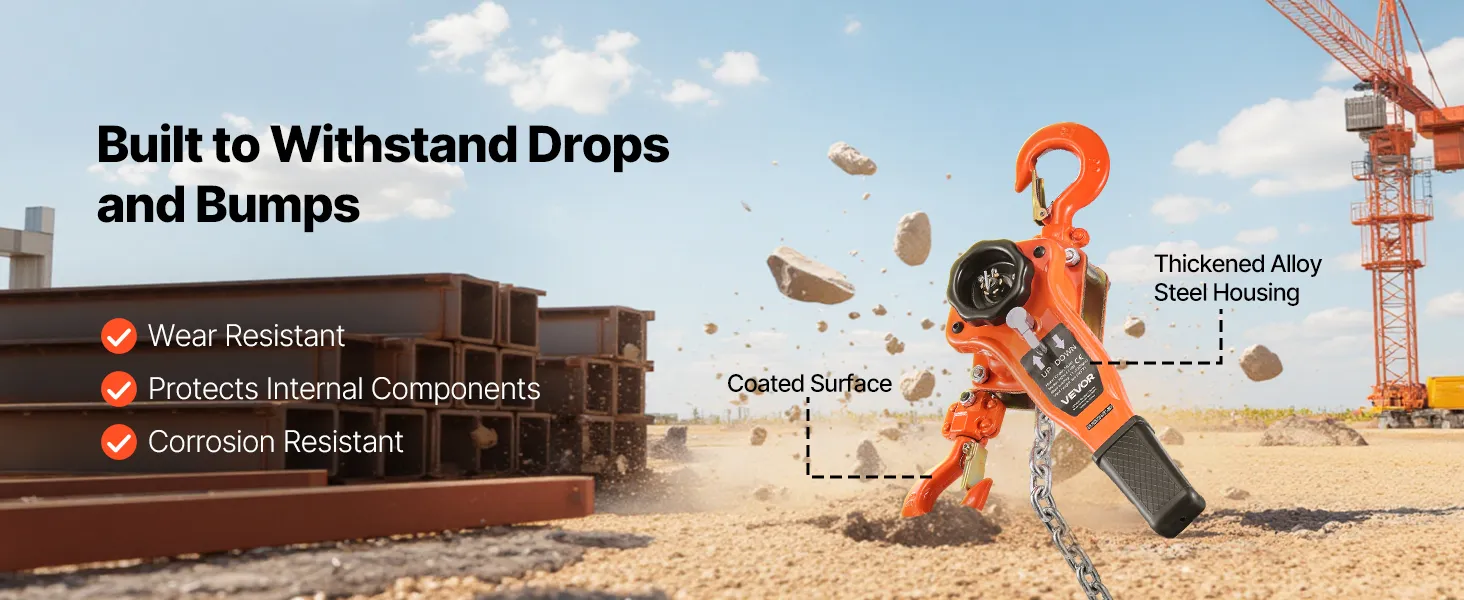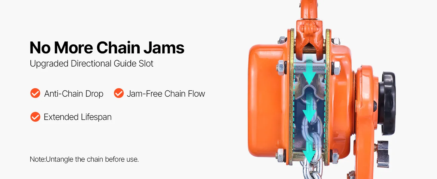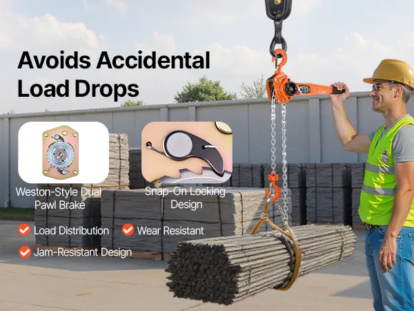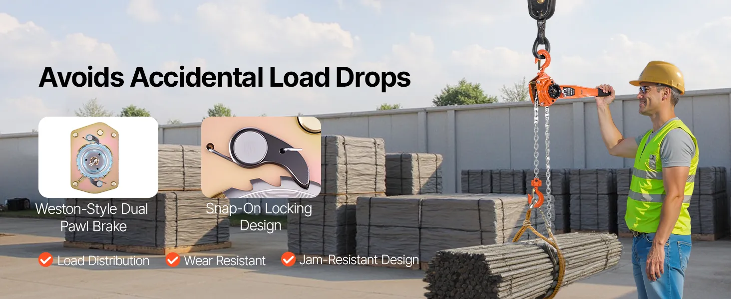 Equipped with an internal Weston-style dual pawl brake that evenly distributes heavy loads. Ensures secure load holding and avoids accidental drops, making lifting operations more secure.