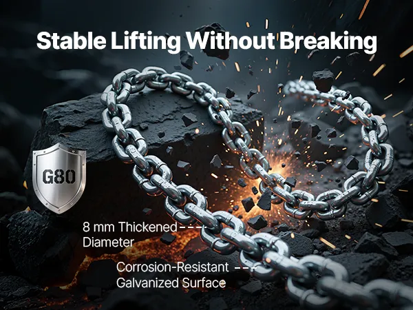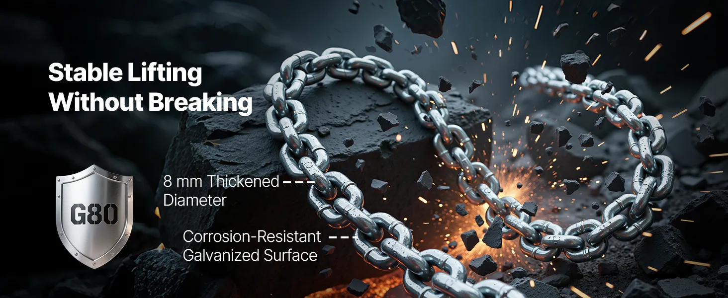 Made with industrial-grade G80 chain, built to withstand heavy-duty loads. Galvanized surface offers corrosion-resistance and durability, suitable for various working conditions.