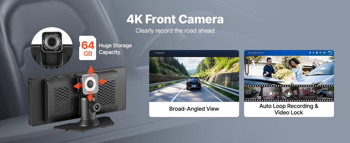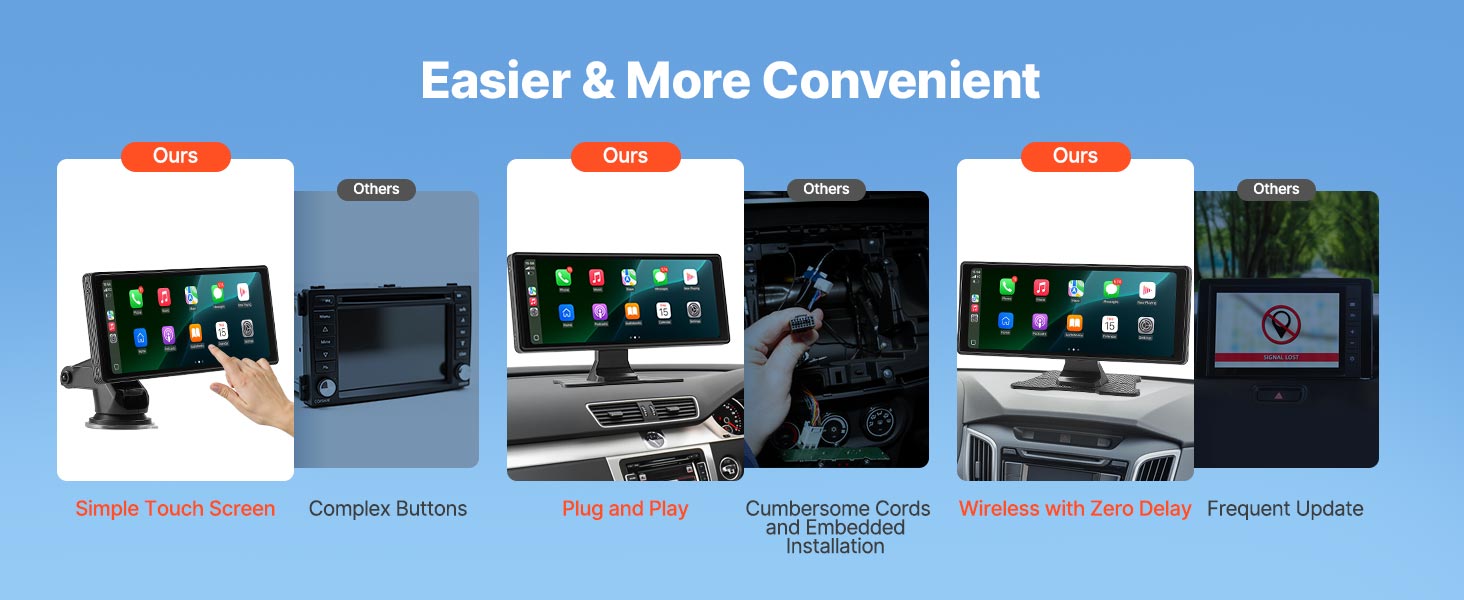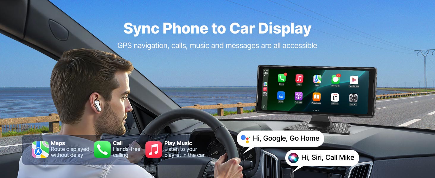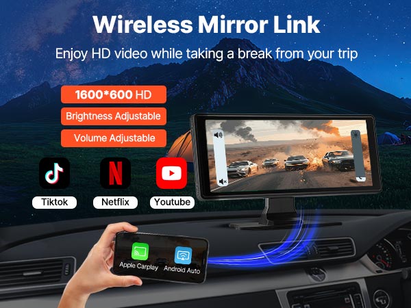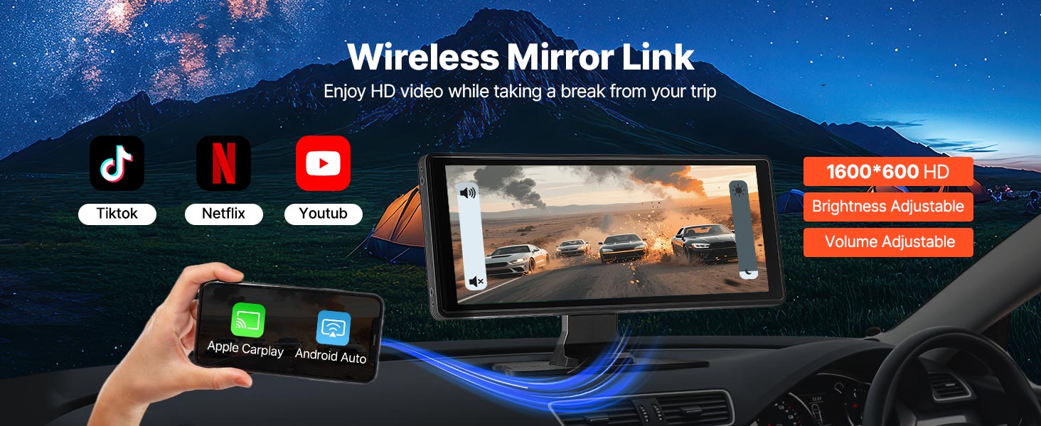 VEVOR Wireless Car Stereo, 254 mm HD Portable Radio Touch Screen with Apple CarPlay and Android Auto, CarPlay Screen with Front & Backup Cameras, Voice Control, Mirror Link, Bluetooth, GPS Navigation