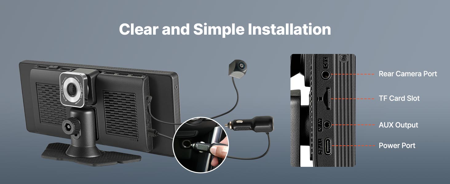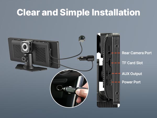 This car screen is equipped with all essential functions, with clearly labeled ports for quick and simple connections.