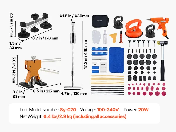 • 100 Pcs Paintless Dent Puller Kit: This kit includes everything you need in a tool bag: 1 x slide hammer, 1 x dent lifter, 1 x bridge puller, 3 x suction cups, 1 x repair pen, 9 x replacement heads, 1 x rubber hammer, 54 x puller tabs, and more