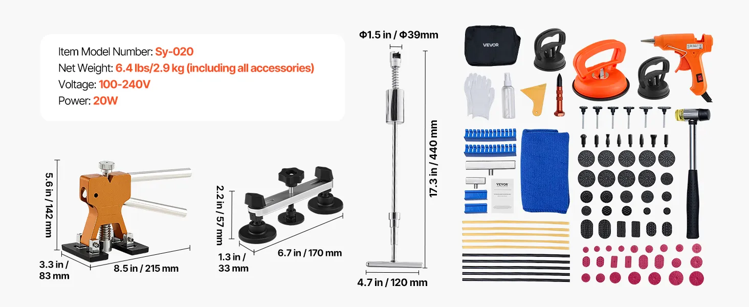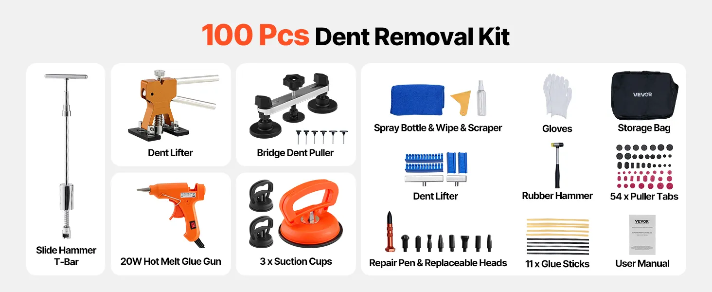 VEVOR набір для безфарбового видалення вм’ятин 100 шт з ковзним молотком, Т-подібним стрижнем, клейовим пістолетом – для авто, холодильників і пральних машин