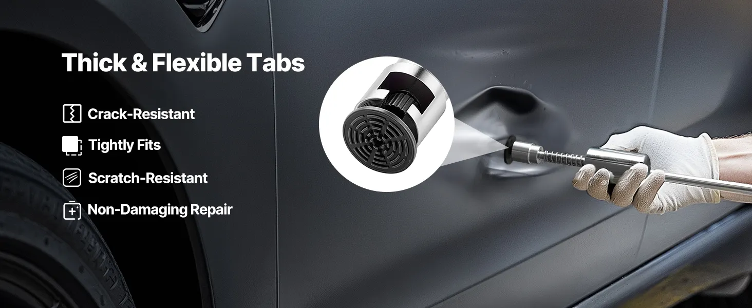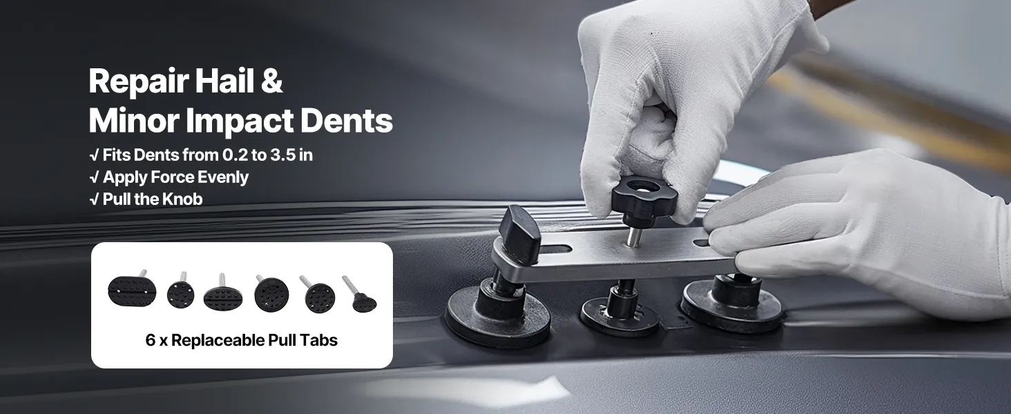 • Works on Various Dents: This paintless dent removal kit comes with multiple sizes of pull tabs, handling tiny hail dents and medium-sized collision dents. The solid rubber tabs are tough and reusable, and grip tightly without damaging your paint