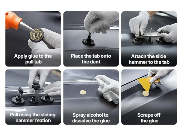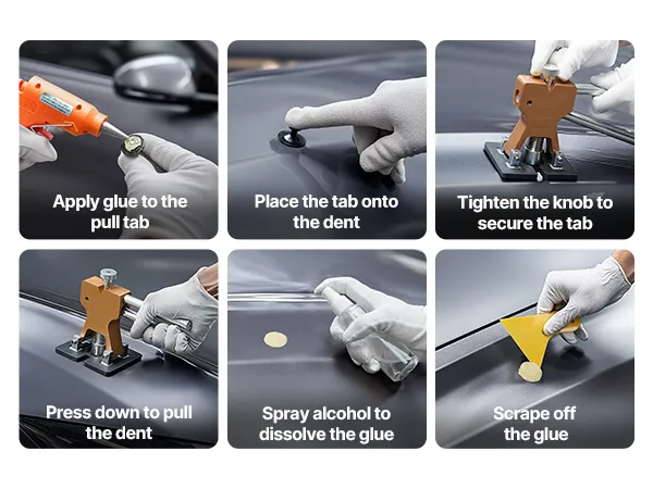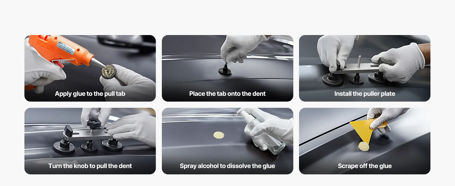 • High-Viscosity Hot Melt Glue: Our dent kit includes a glue gun and hot glue to firmly bond pull tabs to the dent. After the job, use high-concentration alcohol (not included) to clean—no sticky mess left behind. Note: Clean and dry the surface before use