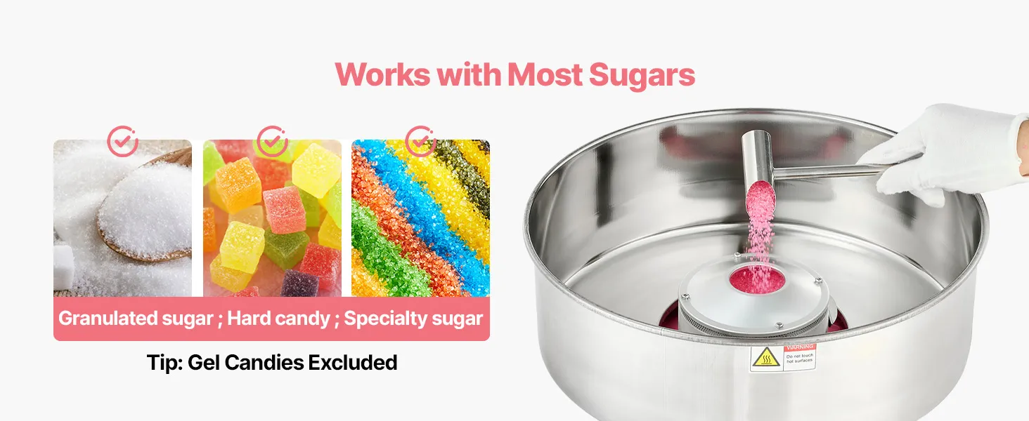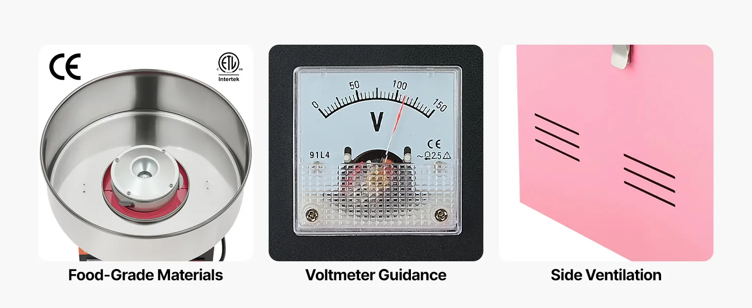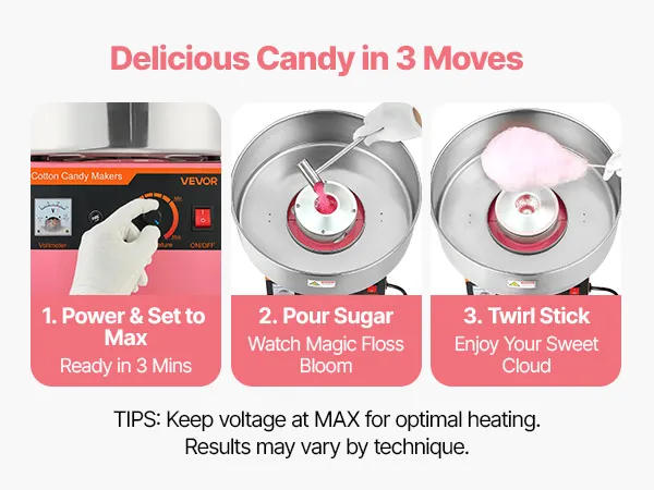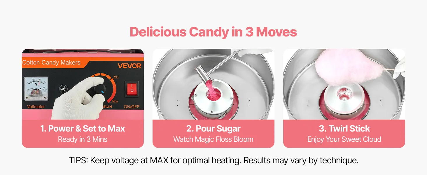Higher voltage for faster heating, Max voltage recommended for cotton candy making.