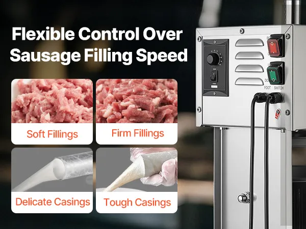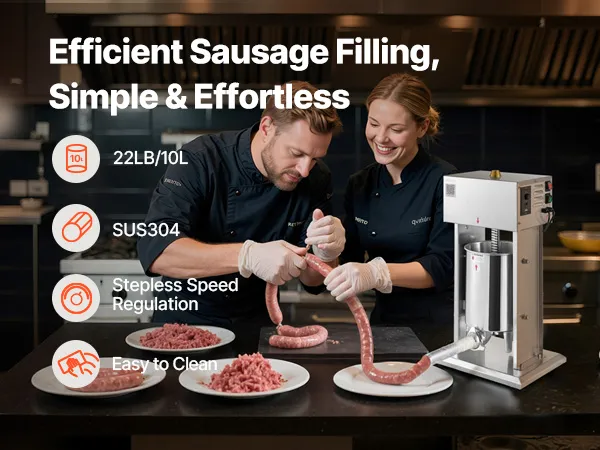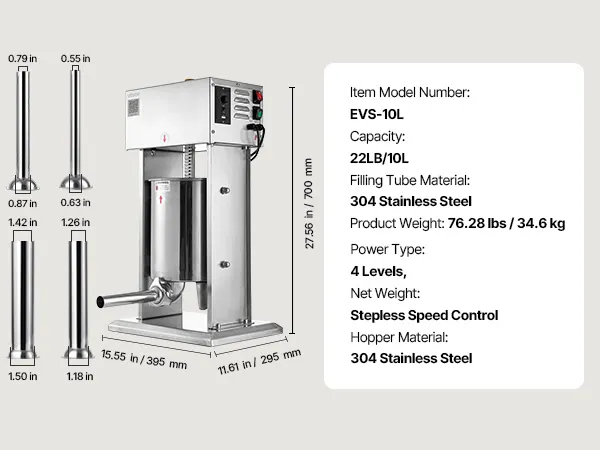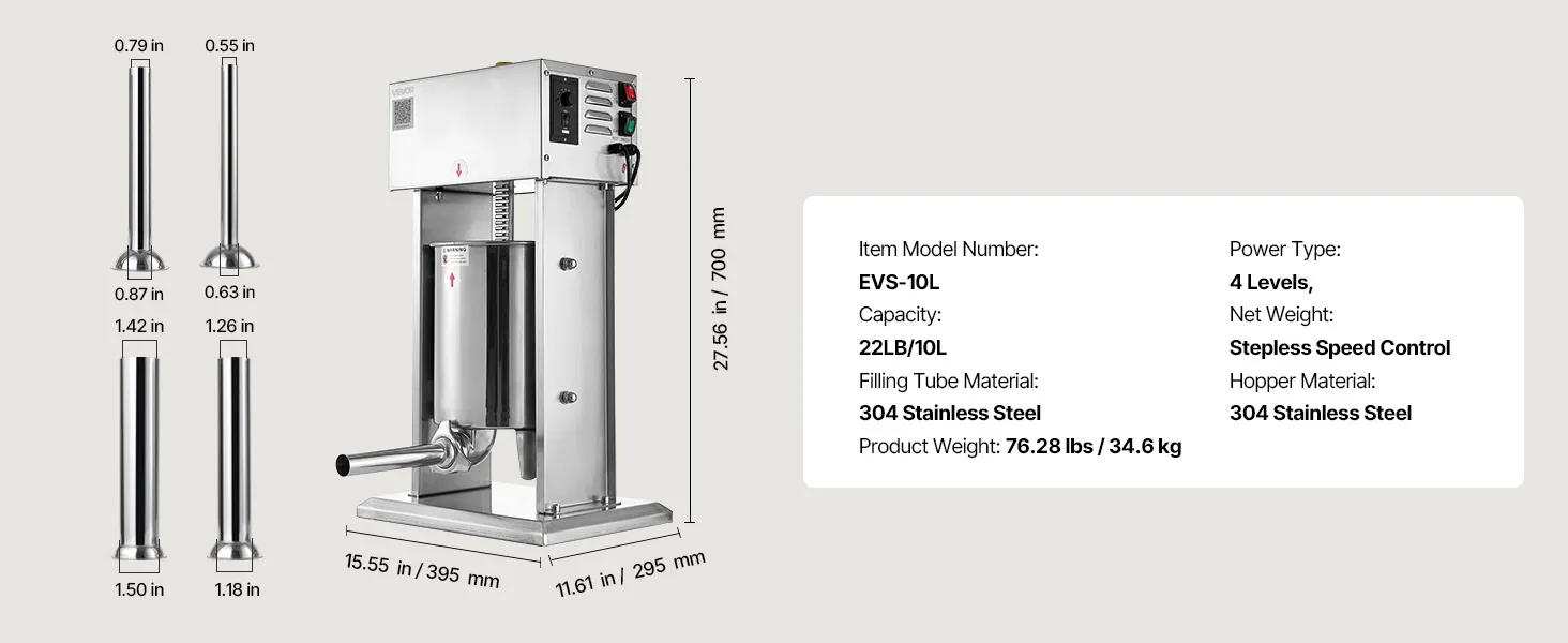 VEVOR Electric Sausage Stuffer, 22 LBS / 10 L Vertical Meat Stuffer, Stepless Speed Control and Foot Pedal, Stainless Steel Heavy Duty Sausage Filler with 4 Stuffing Tubes, for Commercial & Home Use