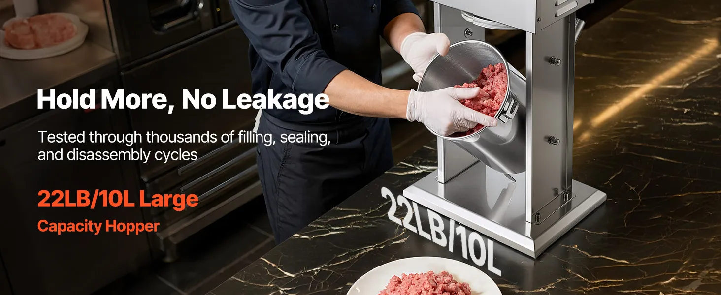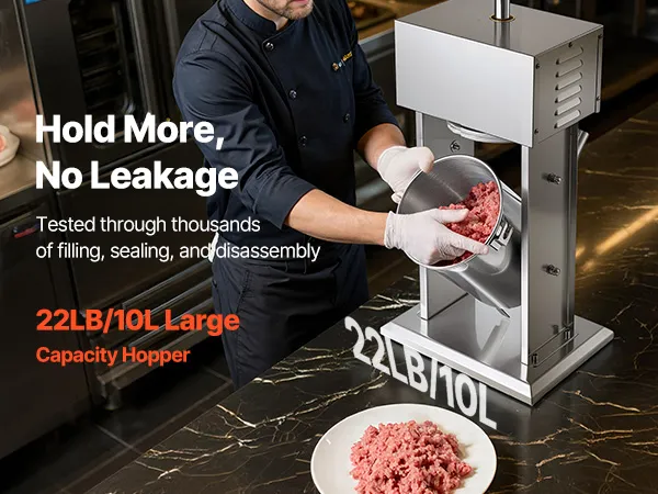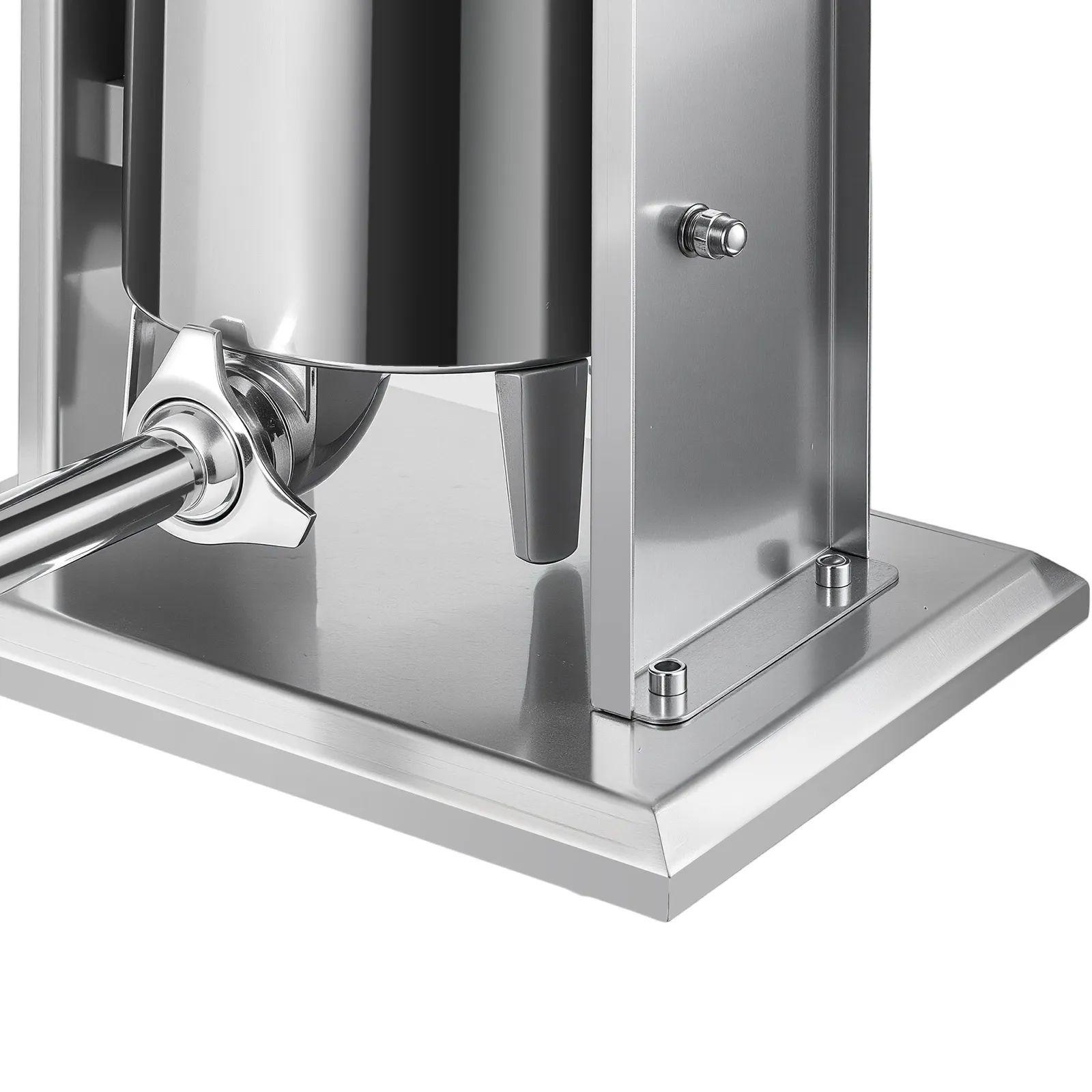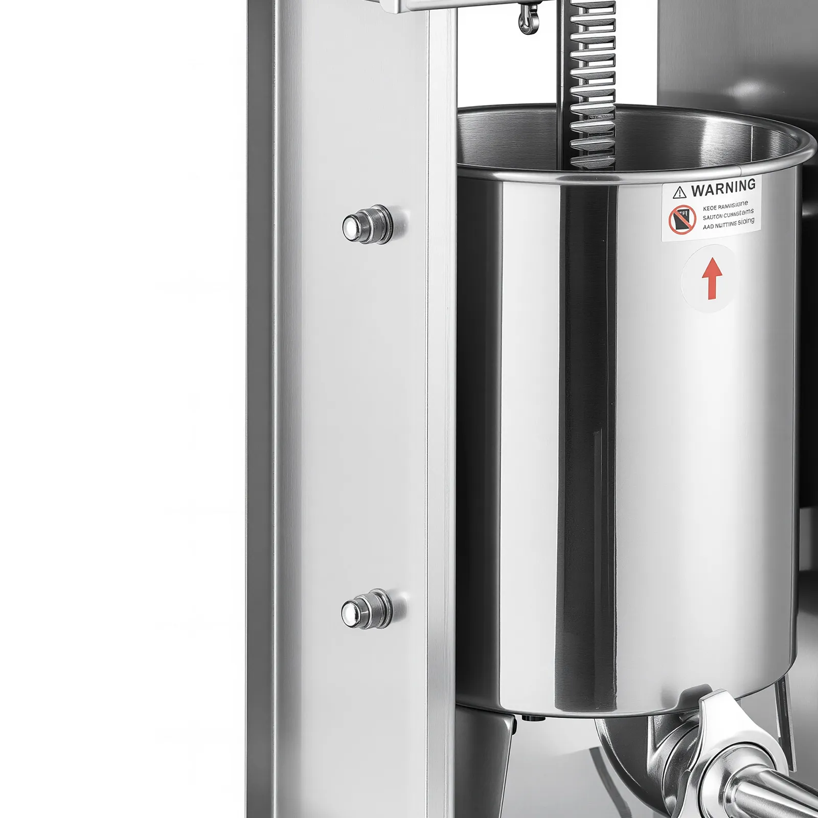 This electric sausage stuffer features an upgraded pressure plate with exhaust holes for firmer, low-bubble sausages. The stepless speed control improves efficiency, and its 22 lbs / 10 L large capacity is ideal for restaurants, supermarkets, and other commercial settings.