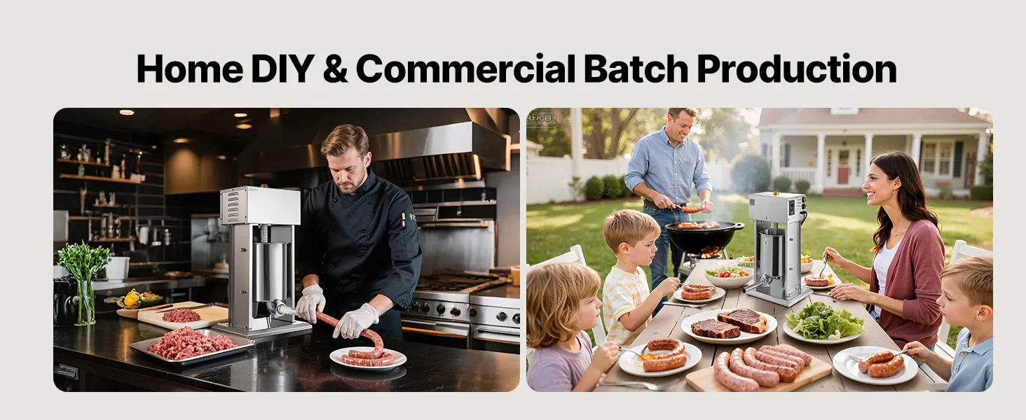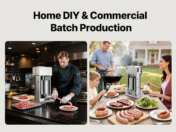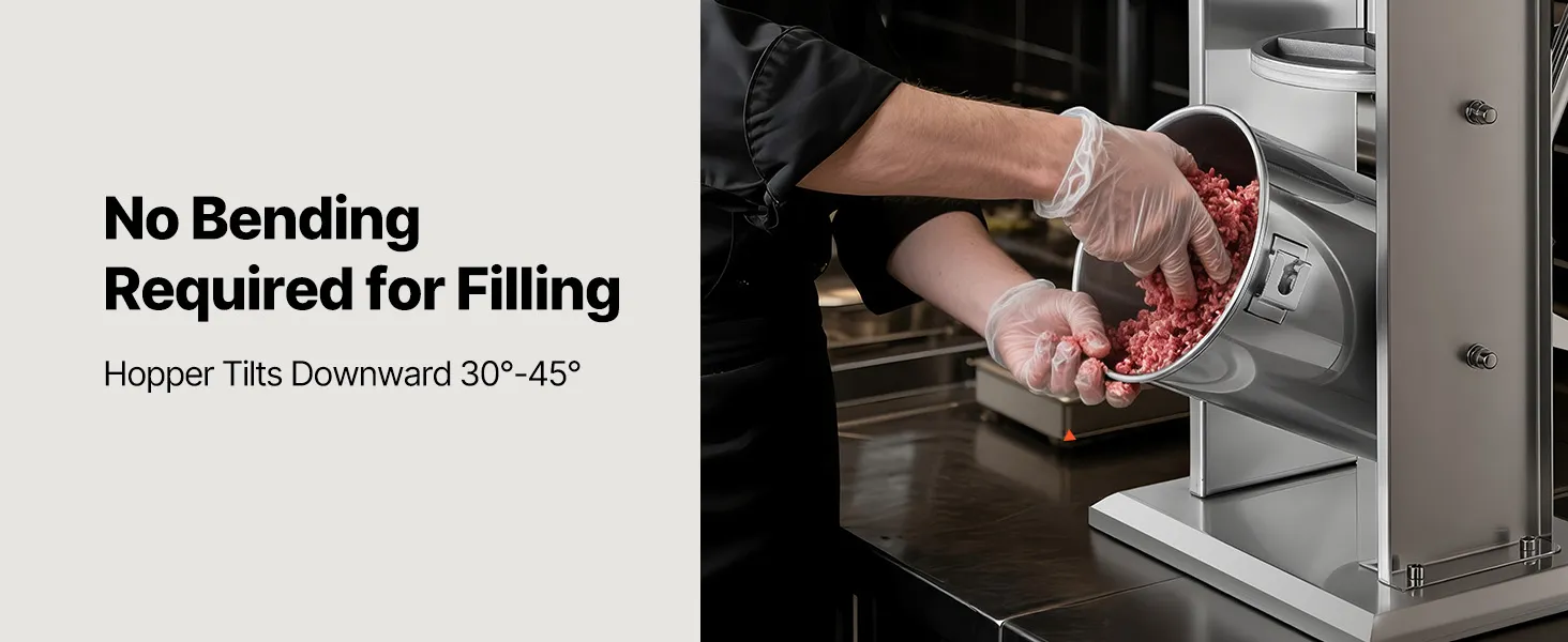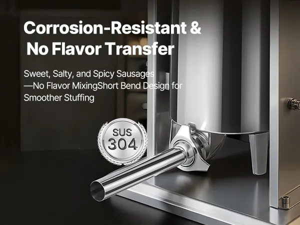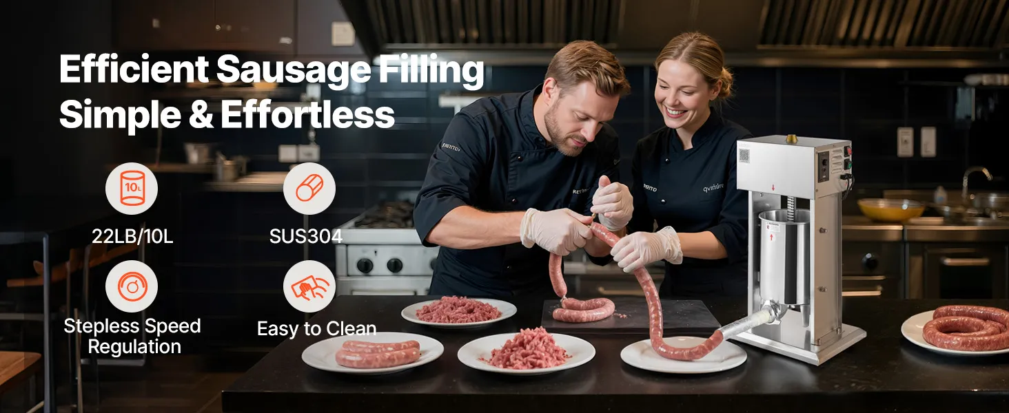 This electric sausage stuffer features an upgraded pressure plate with exhaust holes for firmer, low-bubble sausages. The stepless speed control improves efficiency, and its 22 lbs / 10 L large capacity is ideal for restaurants, supermarkets, and other commercial settings.
