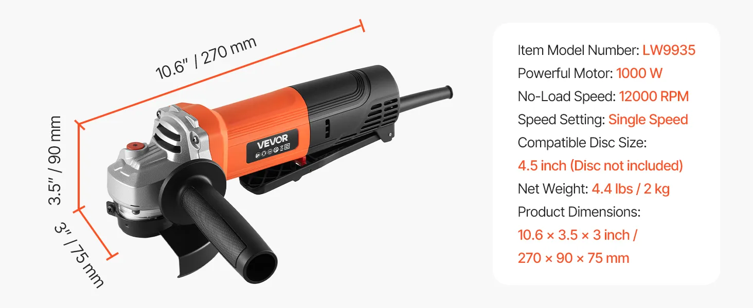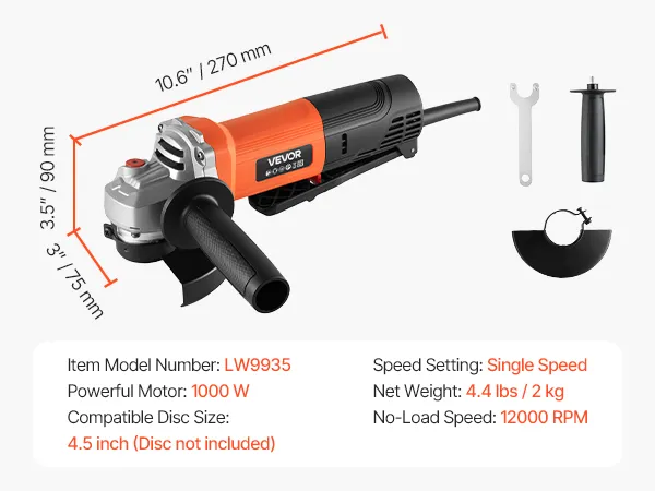 This 4.5-inch (114.3mm) angle grinder is powered by a 1000W motor and operates at a fixed high speed of 12,000 RPM, delivering excellent cutting and grinding performance across a wide range of tasks. Whether for home DIY projects or professional tasks, it’s an ideal choice. (Disc not included)
