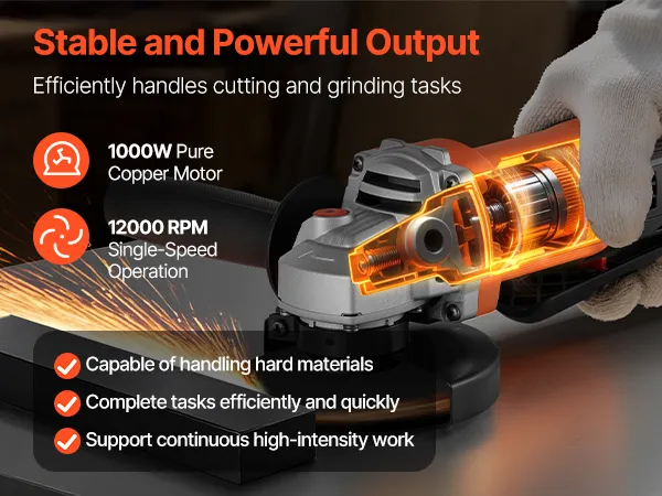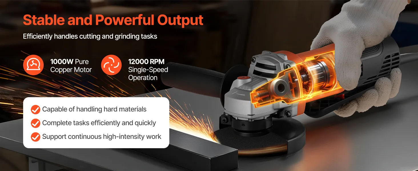 Equipped with a 1000W pure copper motor, this electric grinder power tool delivers steady and strong power. With a high-speed 12,000 RPM output, it handles cutting and grinding tasks with speed and precision.