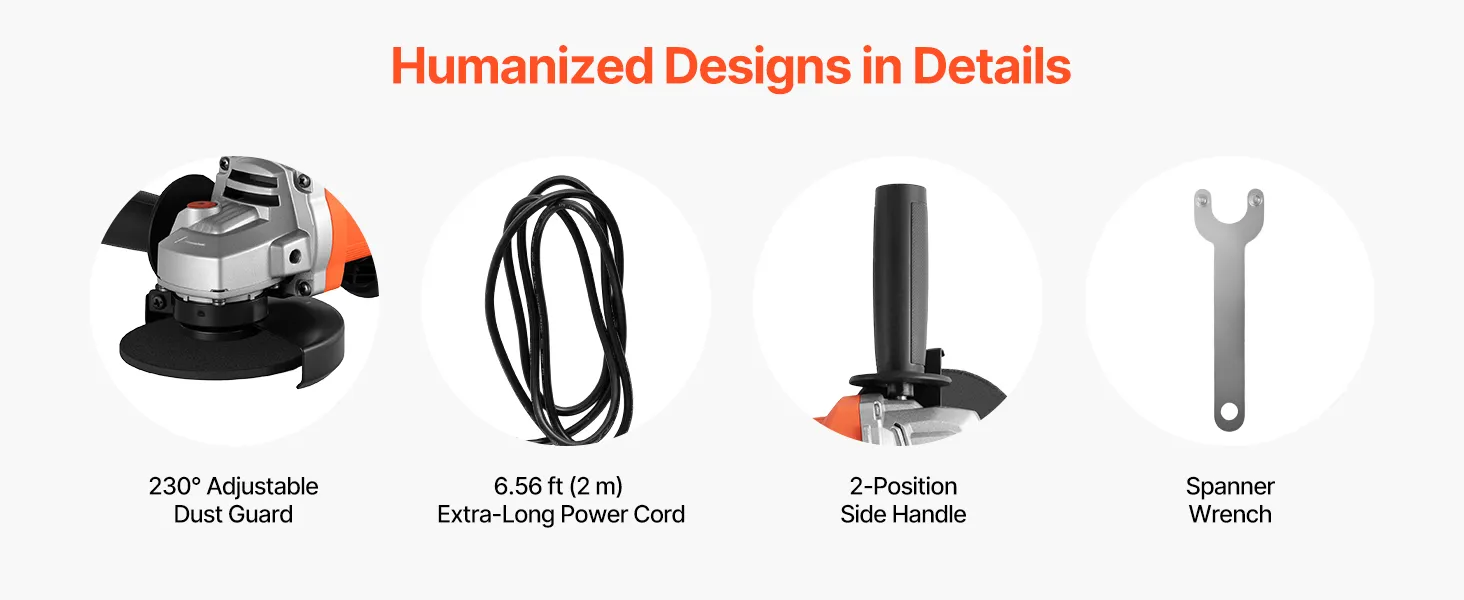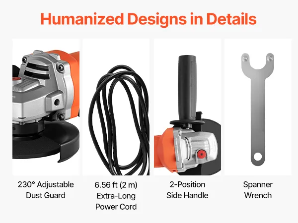Thoughtfully designed with a 230° adjustable dust guard, 6.56 ft (2 m) extra-long power cord, and 2-position side handle, this angle grinder offers greater flexibility, safety, and comfort during every use.