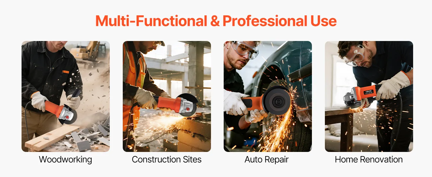 Designed for both professionals and DIYers, this multi-functional angle grinder is ideal for woodworking, construction sites, auto repair, and home renovation projects—meeting your cutting and grinding needs.