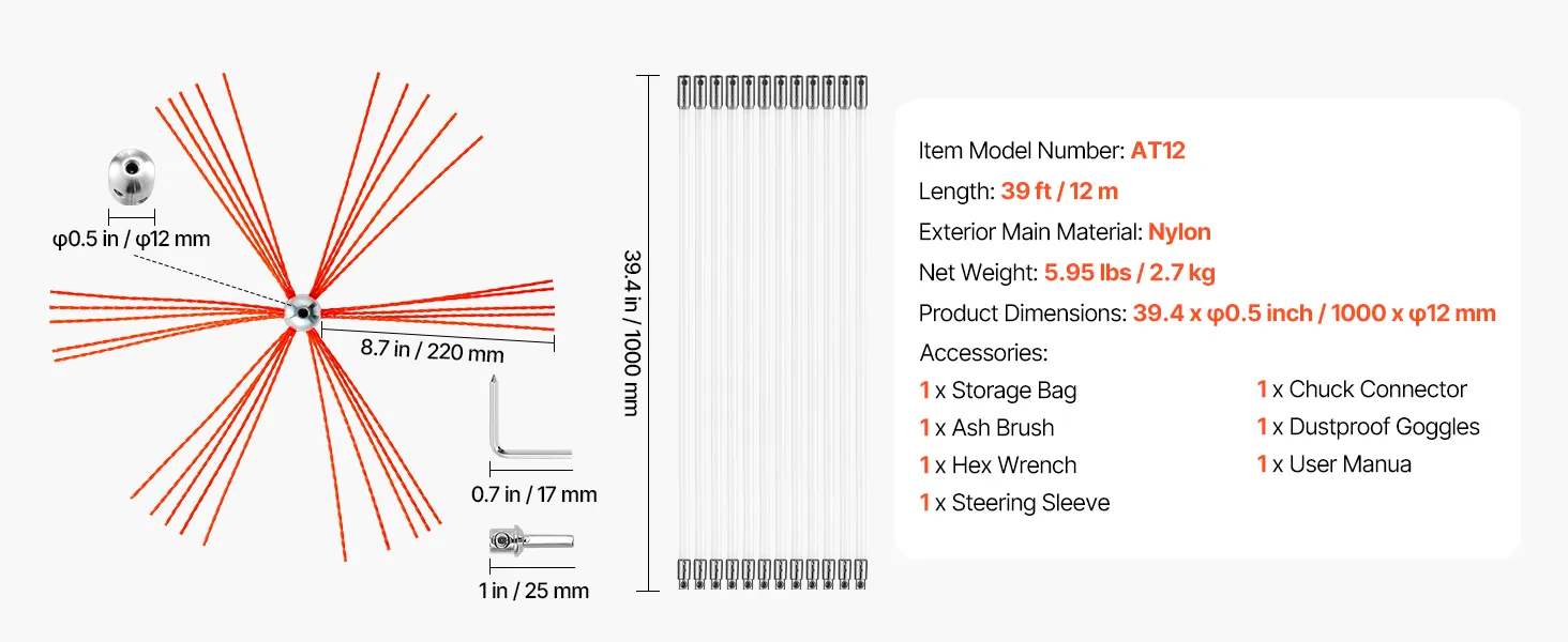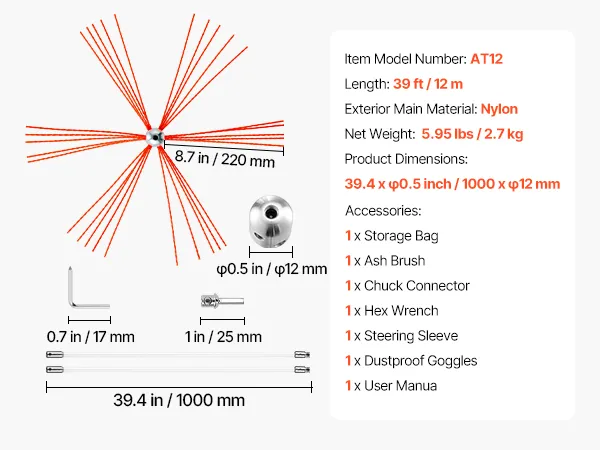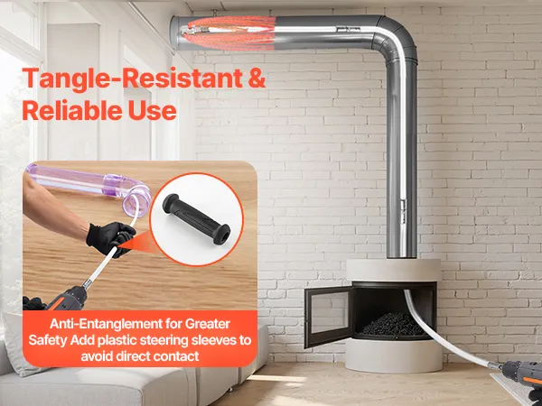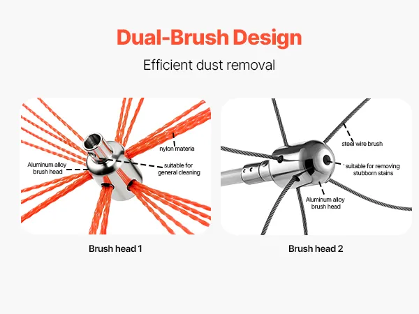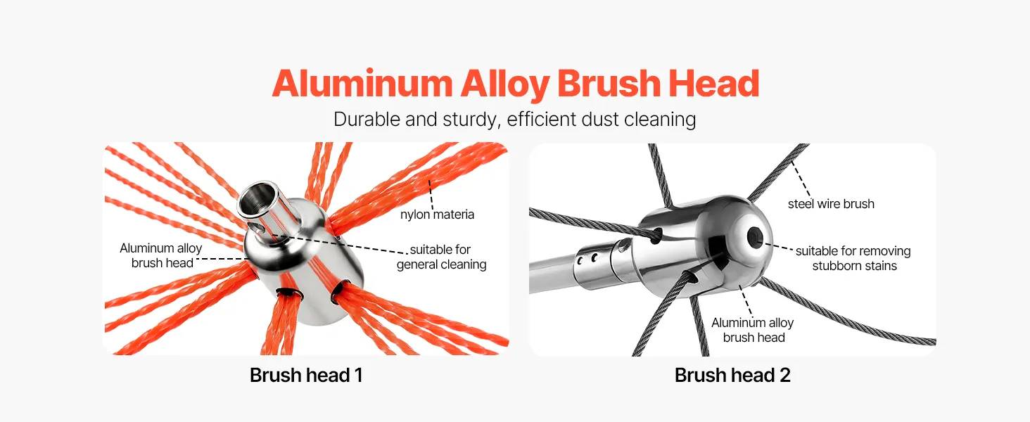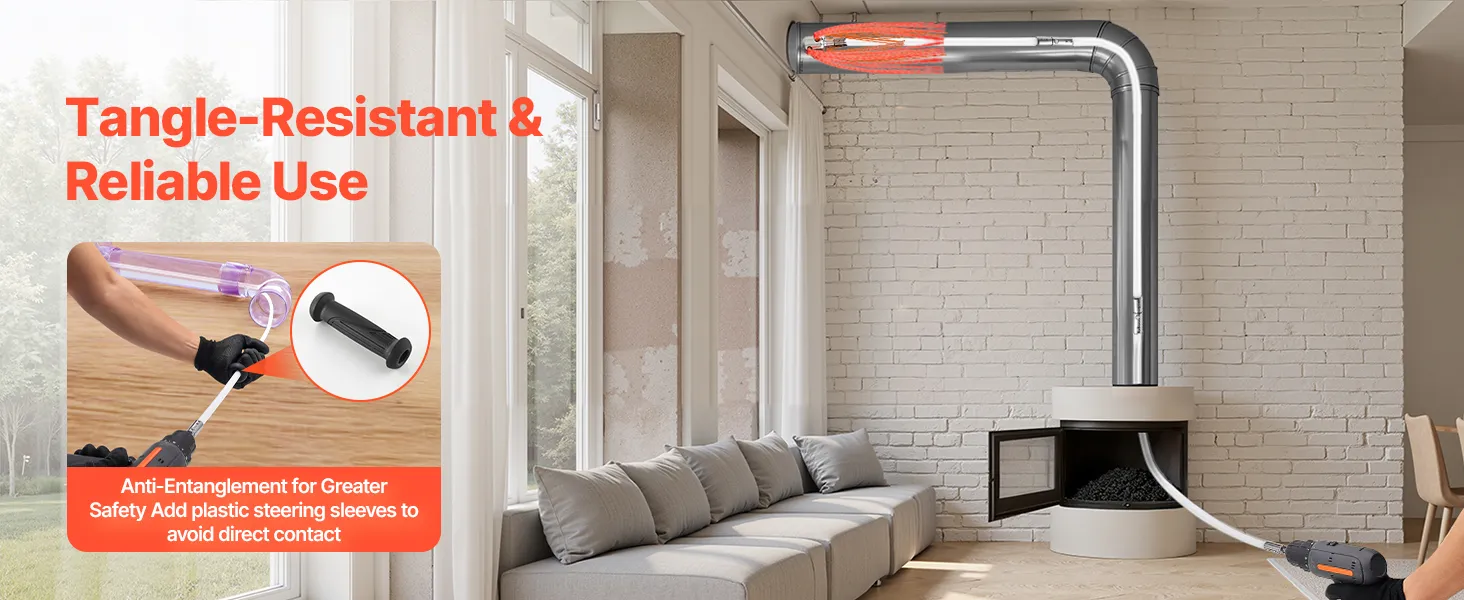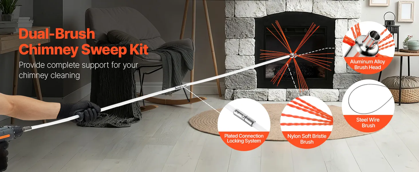 Get everything you need with this dual brush heads chimney sweep kit, featuring upgraded aluminum alloy brush heads and a plastic sleeve for safety. With a maximum extension of 39 ft / 12 m, this kit makes cleaning hard-to-reach chimneys a breeze.
