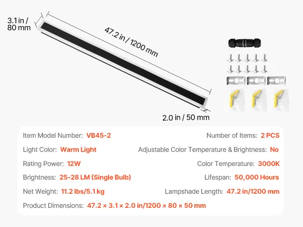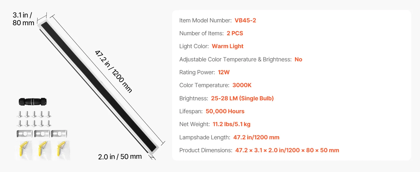 VEVOR Outdoor Wall Lights, 2 Pack, 1200 mm Long Strip Modern Exterior Wall Sconce Light Fixtures, 3000K Warm White, IP65 Waterproof Anti-Rust Outside Wall Mount Lighting, for House, Porch, Garage