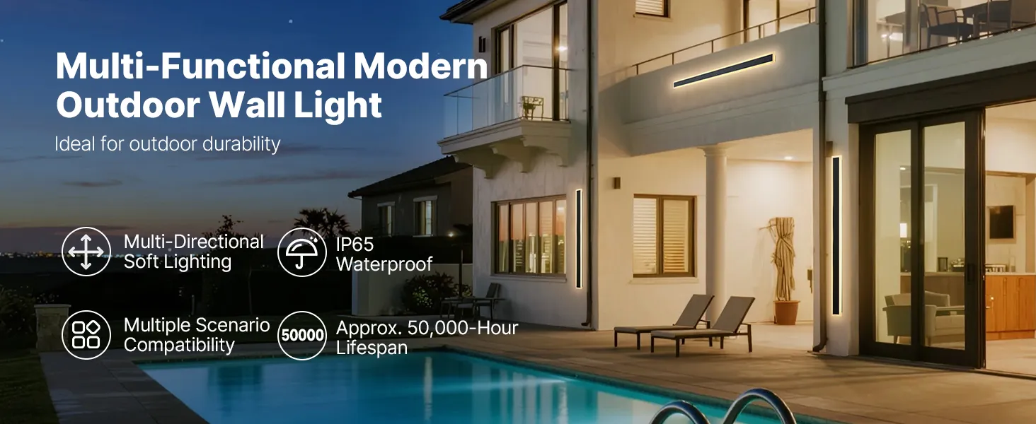 Multi-directional soft light creates ambient moods, and IP65 waterproof ensures durability. Energy-efficient outdoor wall light with extended lifespan elevates functionality and aesthetics, is ideal for gardens, entryways, and commercial facades.