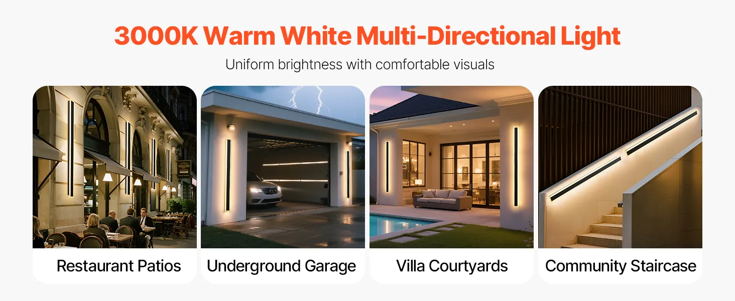 Delivers 3000K warm white light upward, downward, and sideways, this exterior wall light easily creates a gentle atmosphere in outdoor dining areas and villa courtyards. Provides glare-free illumination, it highlights landmarks or guiding pathways while ensuring practical visibility.