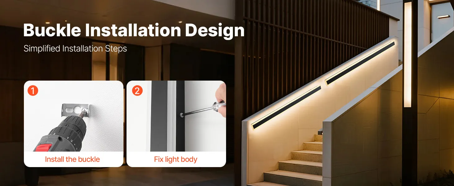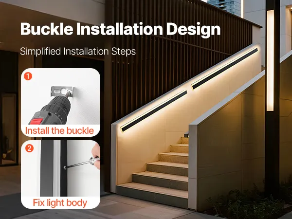 This outdoor wall sconce features pre-grooved wiring channels and buckle installation. First, organize wiring within channels, then fix the light body through the buckle. The two-step process simplifies complex operations and is suitable for various outdoor installations.