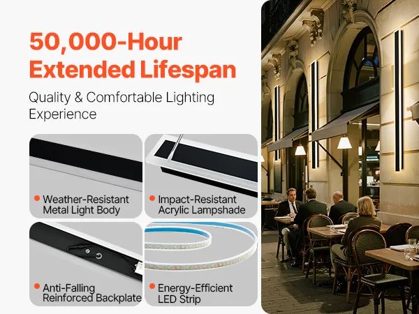 Reliable protection system with weather-resistant metal light body, impact-resistant acrylic lampshade, reinforced backplate, and energy-saving LED strips. The outdoor light fixture wall mount provides up to 50,000 hours of extended lifespan after rigorous testing.