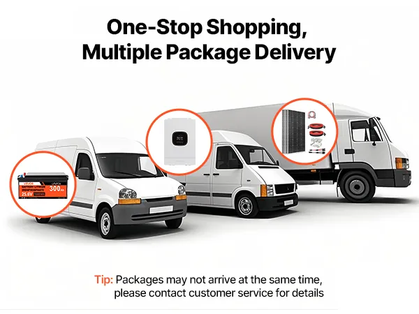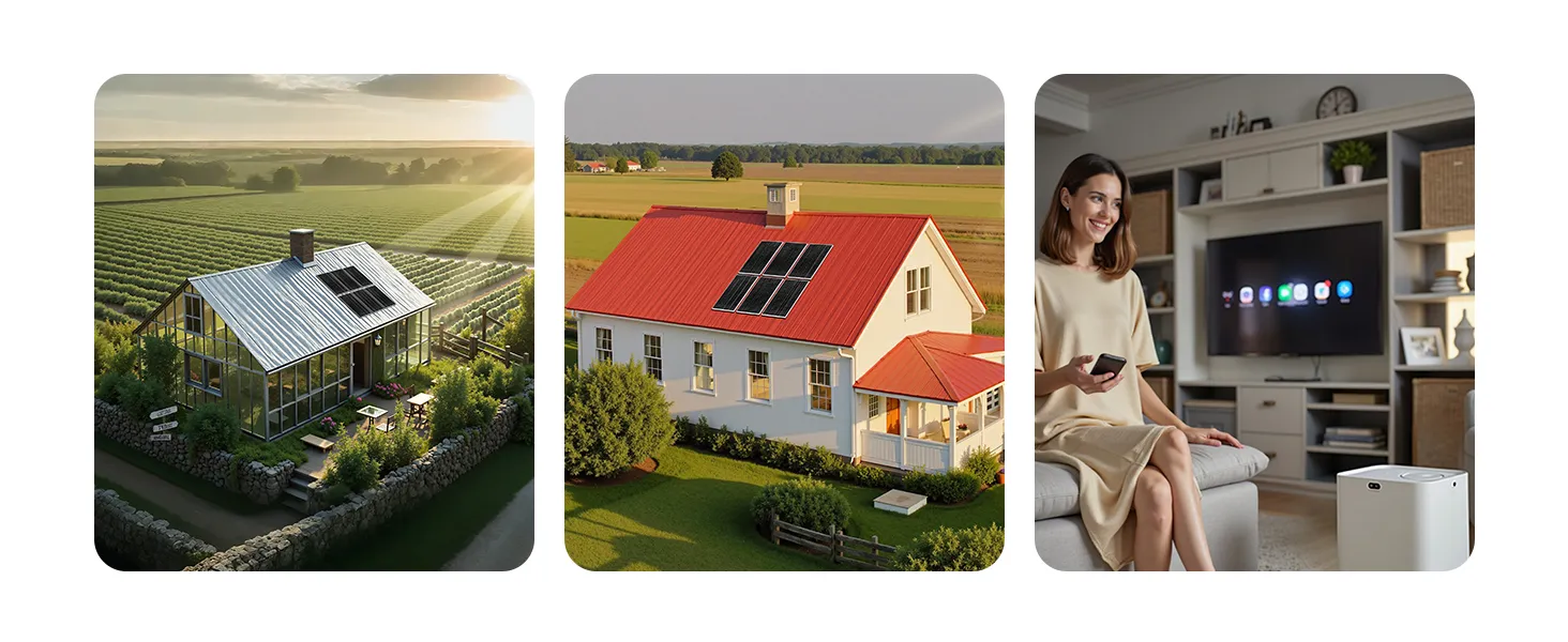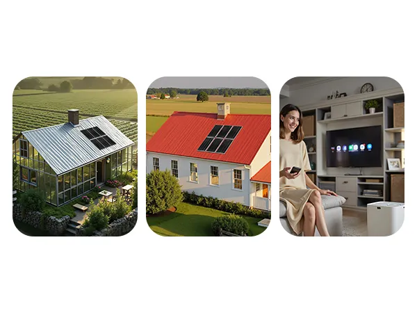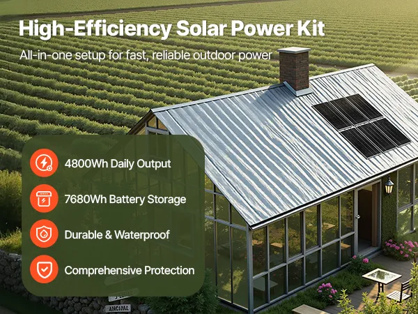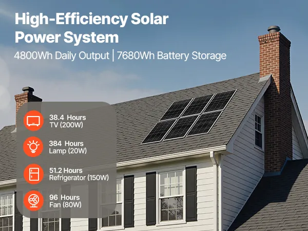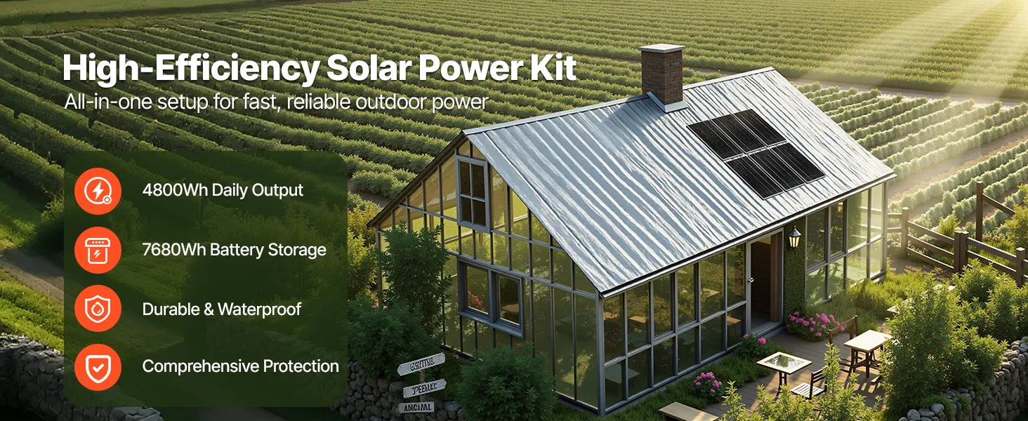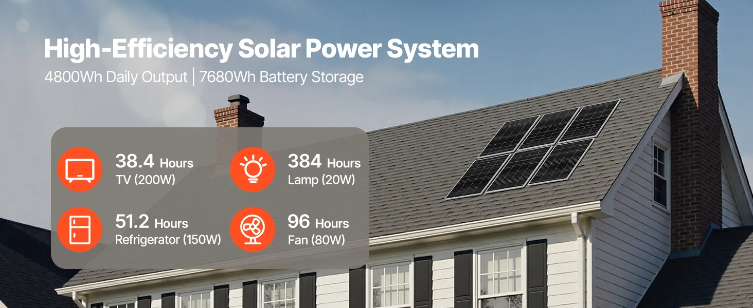This solar power kit includes 6pcs 200W solar panels, a 25.6V 300Ah LiFePO₄ battery, and a 24V 3600W hybrid solar inverter. With up to 4800Wh/day output and 7680Wh battery storage, it delivers high output to efficiently power large houses, sheds, and farms.