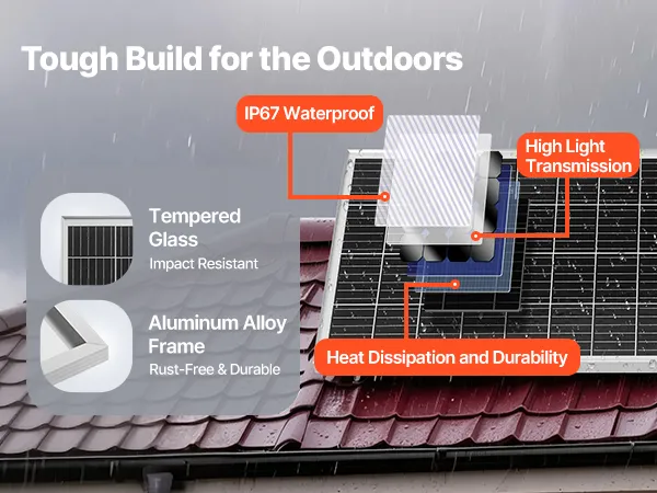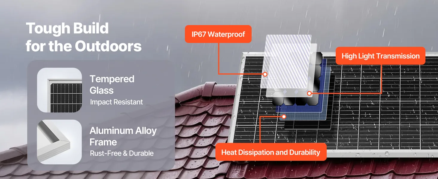 High-efficiency monocrystalline solar cells ensure superior energy conversion. IP67 waterproof rating makes them reliable for long-term outdoor use.