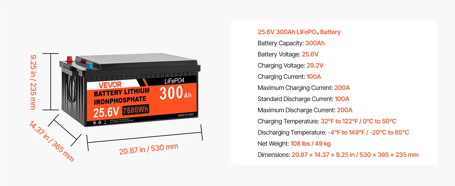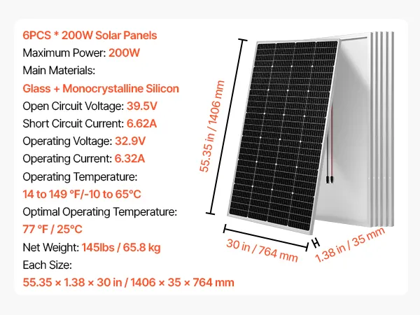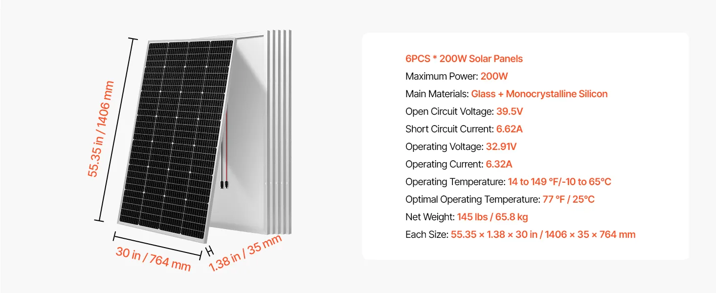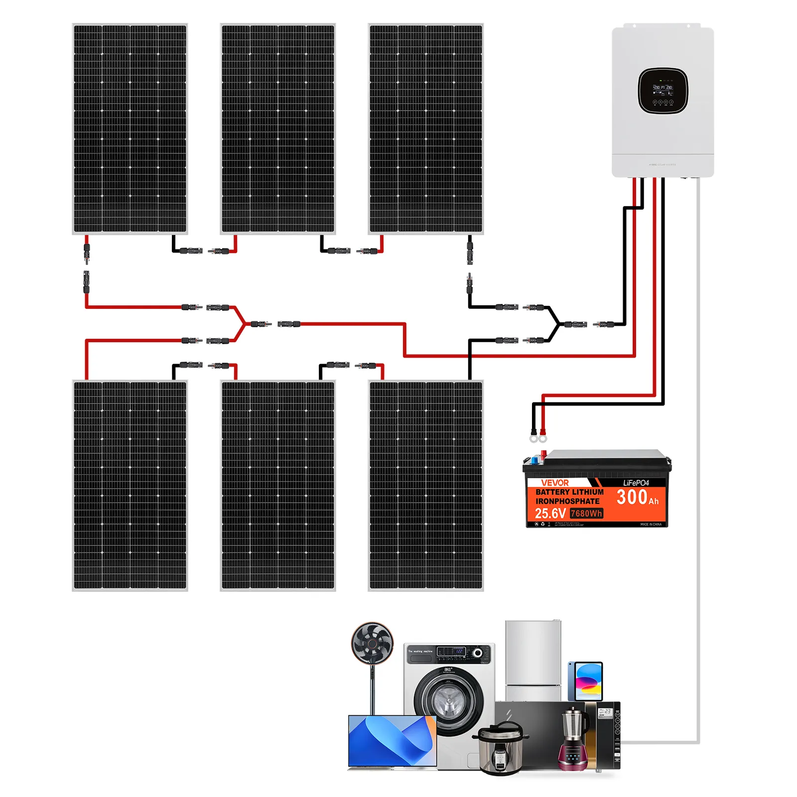 VEVOR 1200W 24V Complete Solar Power Kit, 6PCS 200W Monocrystalline Solar Panels + 25.6V 300Ah LiFePO₄ Battery + 24V 3600W Hybrid Inverter, High Output Off-Grid Solar Kit for Large House Shed Farm