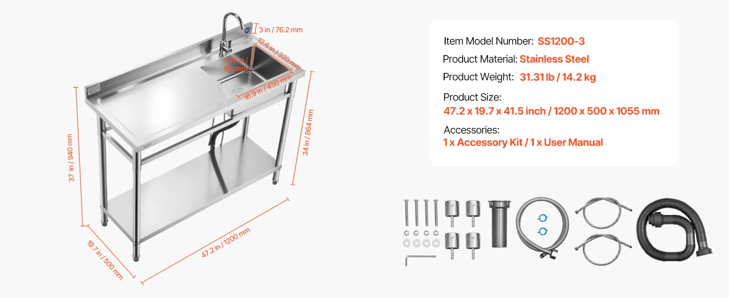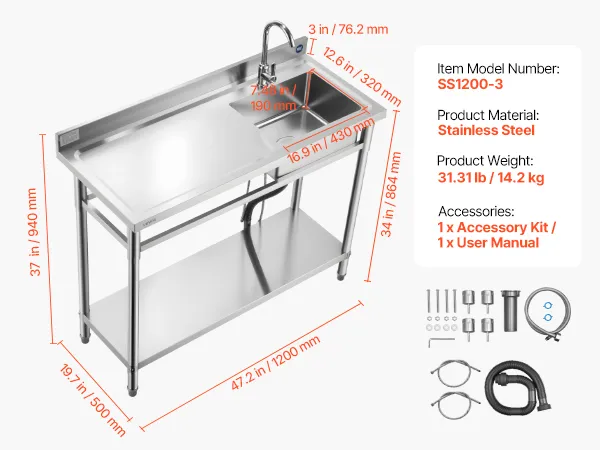 VEVOR Stainless Steel Utility Sink, Free Standing Single Bowl Commercial Kitchen Sink with Faucet, Utility Left Basin Workbench with Hot & Cold Water Pipe for Garage Restaurant Laundry, 1200x500x940mm