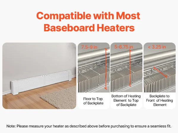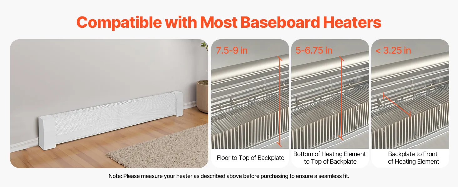 • Standard Size: This 4 ft / 1222 mm baseboard heater cover fits heaters with floor to top of backplate: 7.5-9 inch, bottom of element to top of backplate: 5-6.75 inch, and a back panel-to-element front distance of less than 3.25 inches