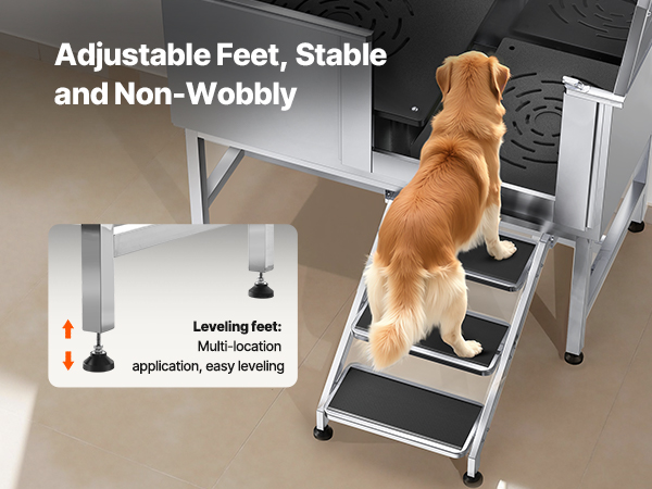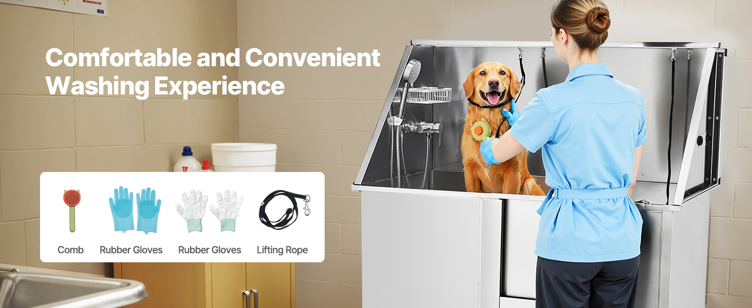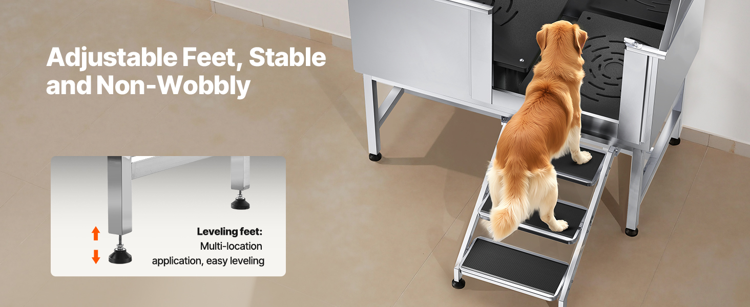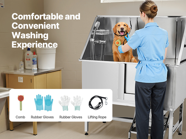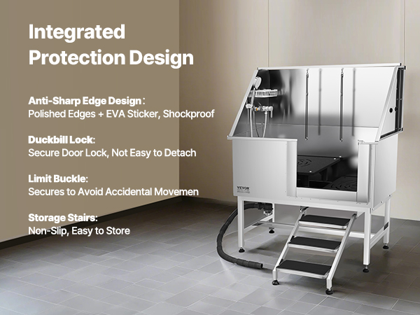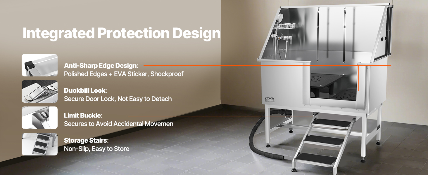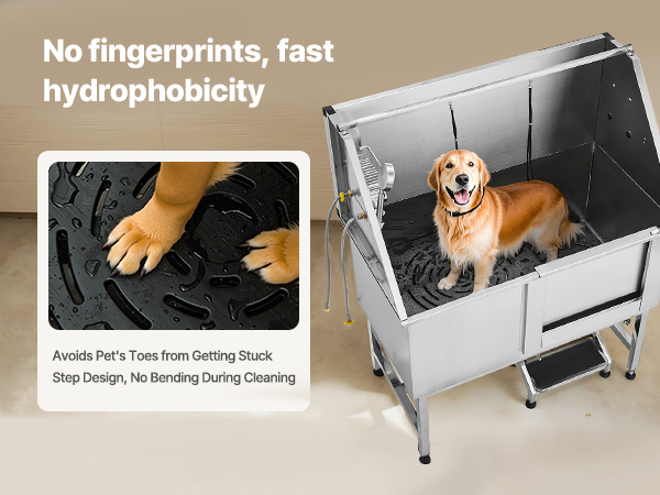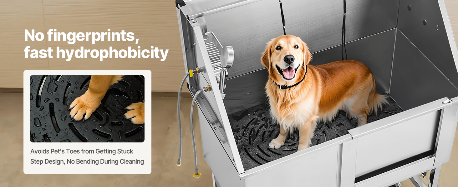 This tub ensures no water leakage. Made from stainless steel, it is corrosion-resistant and sturdy, maintaining its new look over time. The tub features smooth edges, ensuring security for both pets and users during bathing.