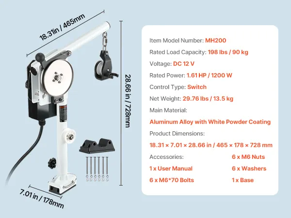 VEVOR 12V 1200W Електрична Лебідка для Лову, Вантажопідйомність 90кг, Швидкість 35 м/хв, 360° Обертання, Для Крабів і Креветок