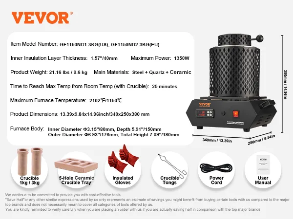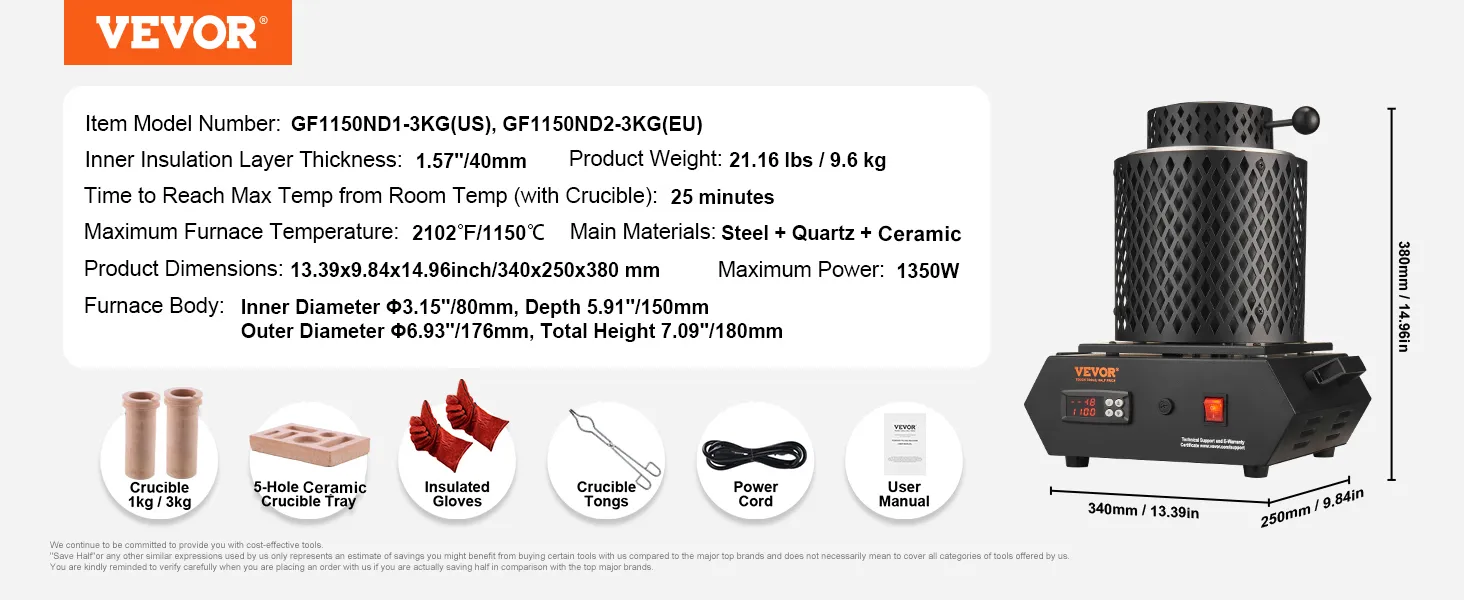VEVOR Gold Melting Furnace, 1350W, 1150°C Max Temperature, Digital Electric Melting Furnace with 1 kg and 3 kg Ceramic Crucibles, Crucible Tongs, and Gloves, for Gold, Silver, Aluminum, Copper