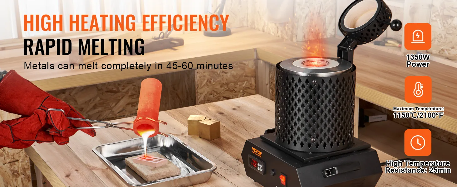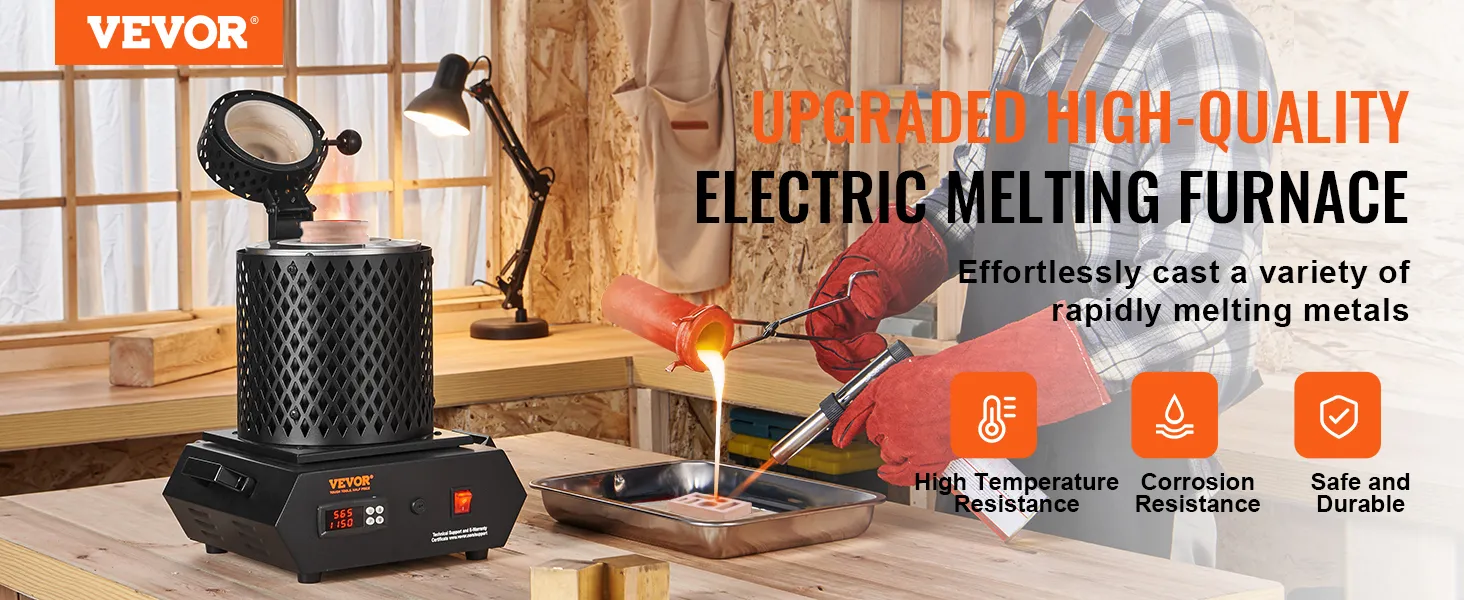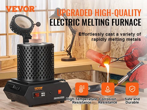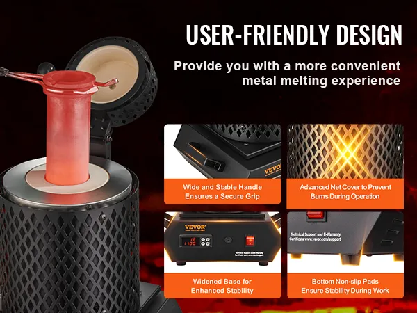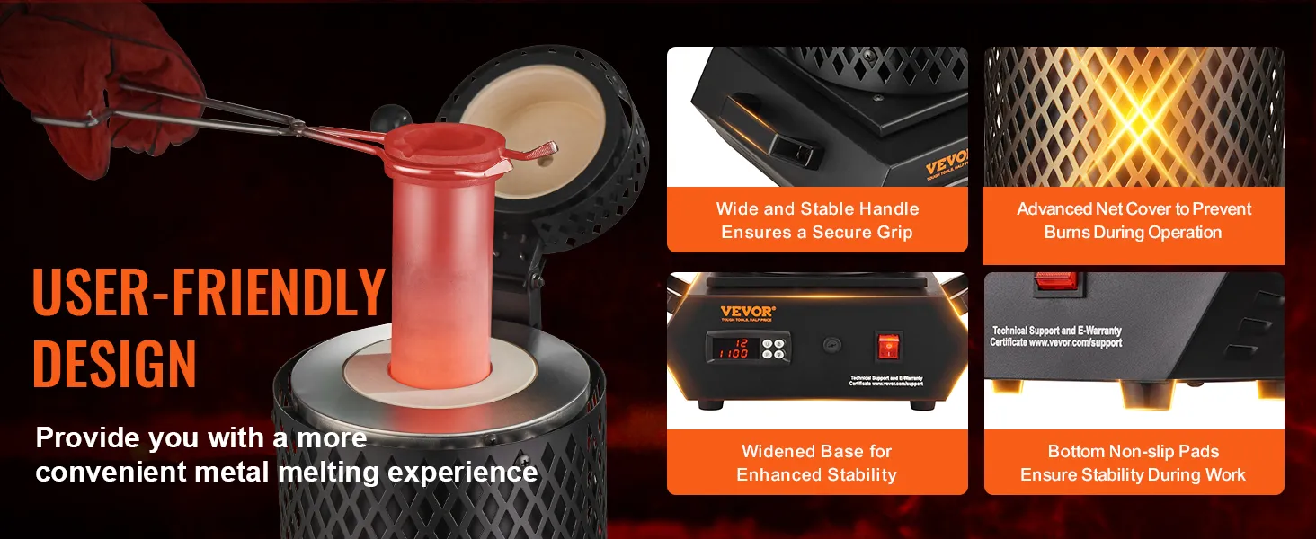 This gold melting furnace comes with high-quality crucibles that withstand high temperatures and rust. Two wide, stable handles and an included heat-proof mesh make handling easier while keeping hands away from the hot furnace walls.