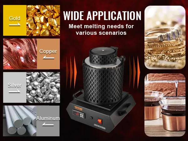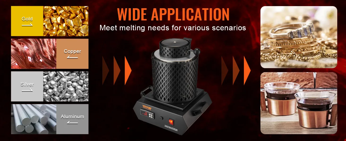 Our melting furnace is ideal for making gold bars, melting precious metals and jewelry, recycling scrap materials, refining jewelry, and casting various metals, including gold, silver, lead, copper, bronze, and aluminum. Note: Handle carefully to avoid contact with high temperatures.