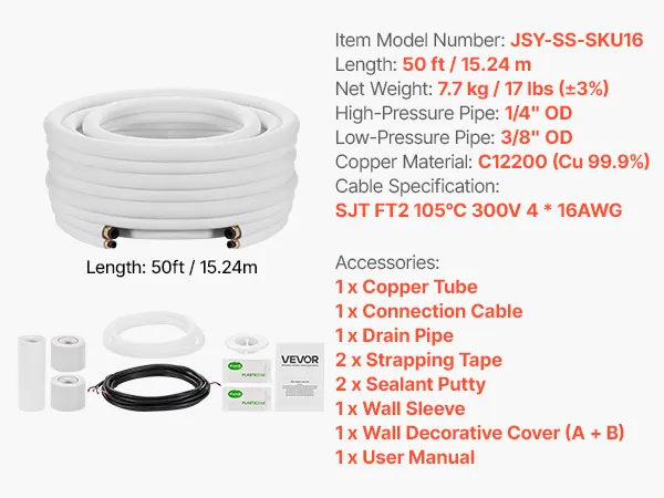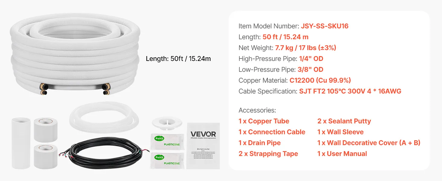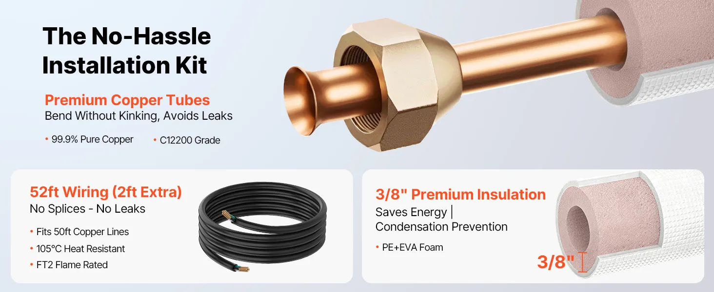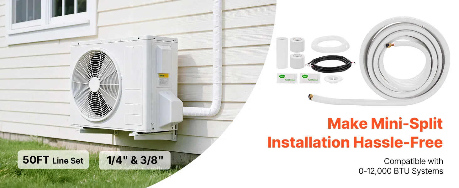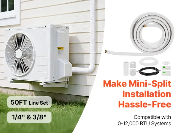 The kit is compatible with mini-split air conditioners. High-purity tubing resists kinking and leaks, ideal for garage or workshop installations. Includes strapping tape and all accessories for immediate use. Simple setup requires only basic tool skills to connect indoor and outdoor units.