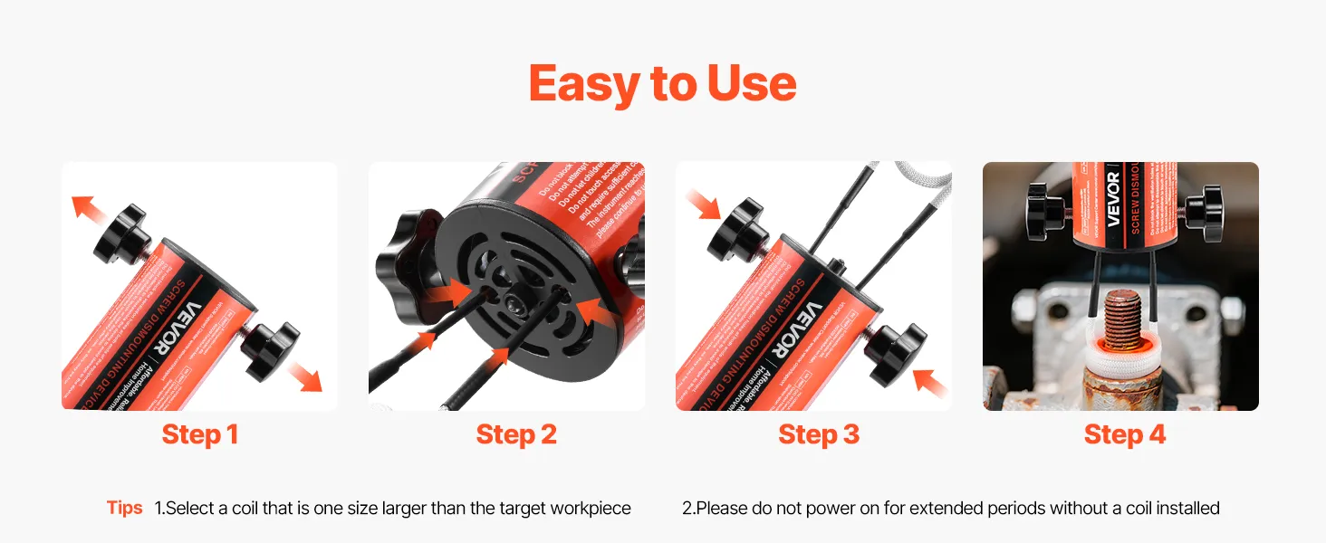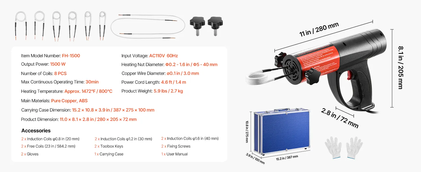 Our handheld magnetic induction heater provides up to 1500W of power, easily accelerating the removal of rusted bolts and nuts, with a maximum continuous use time of 30 minutes. It's stable and durable.