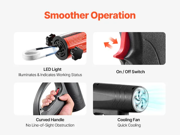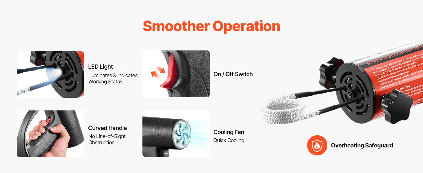 The handheld design ensures a stable grip and more flexible operating angles. The built-in cooling fan helps guard heat-sensitive parts. The bright LED light at the end helps you work smoothly in the dark and serves as a reminder not to touch the coils.