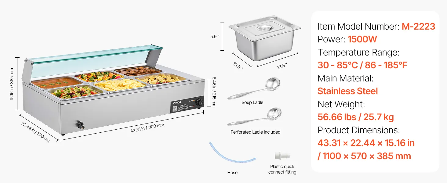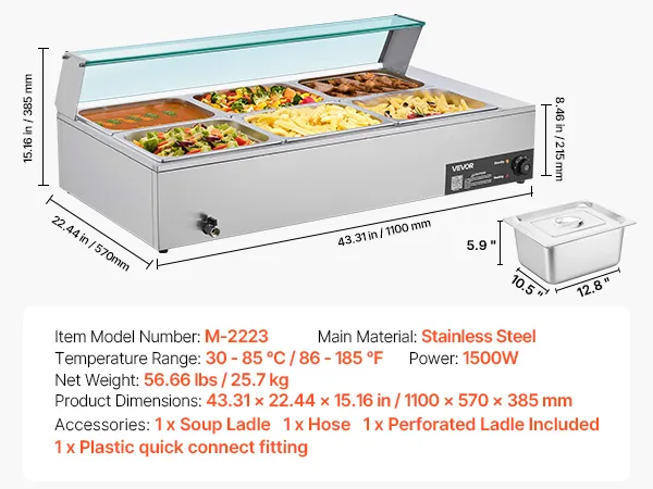 VEVOR Commercial Food Warmer, 1500W Electric Stainless Steel Steam Food Warmer with Glass Cover, 6 x 1/2 Size Pans Buffet Bain Marie with Soup & Perforated Ladles, for Catering, Restaurant & Party