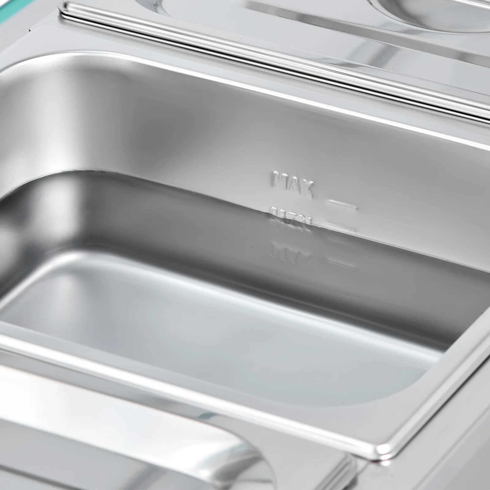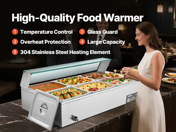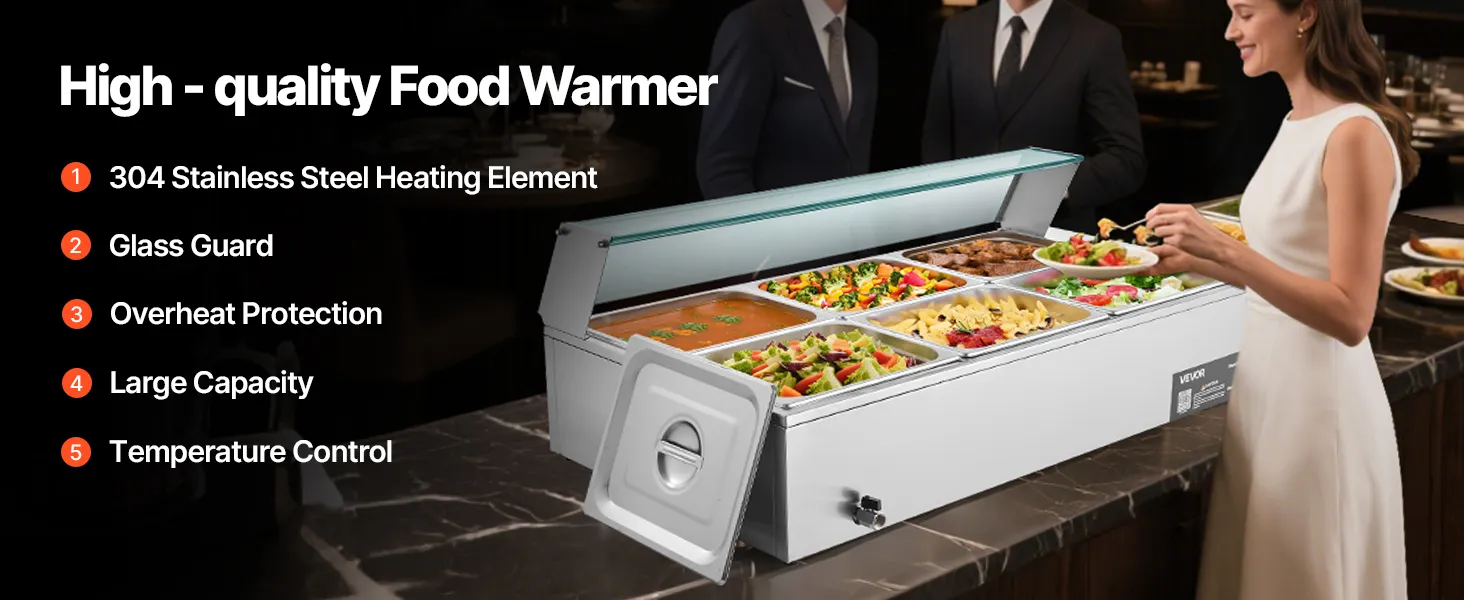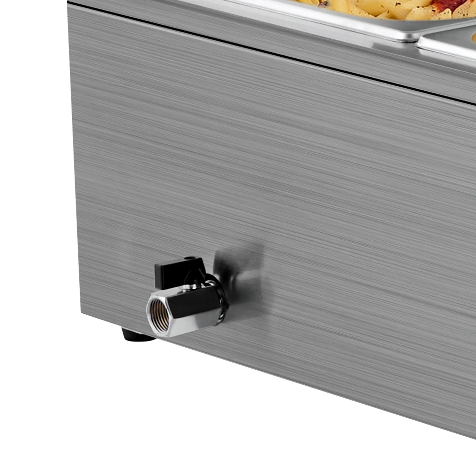 Made of stainless steel for durability and easy cleaning, this food warming features a wide U-shaped heating tube, adjustable temperature (30-85°C / 86-185°F), and a large chamber ideal for hotels, buffets, snack bars, and outdoor parties.