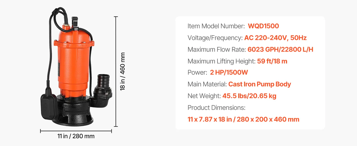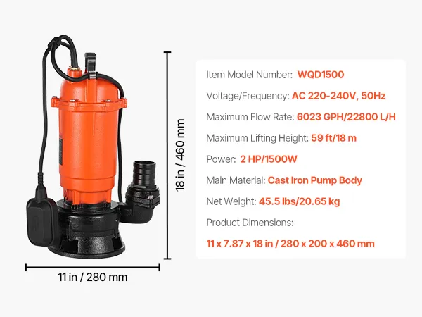 Power through tough sewage drainage jobs with this 1500W (2 HP) sump pump, delivering a 22,800 L/h (6023 GPH) max flow rate and a 18 m (59 ft) max head lift. The cast iron housing and an IPX8 waterproof rating for reliable submersible performance. Ideal for draining pools, ponds, farms, etc.