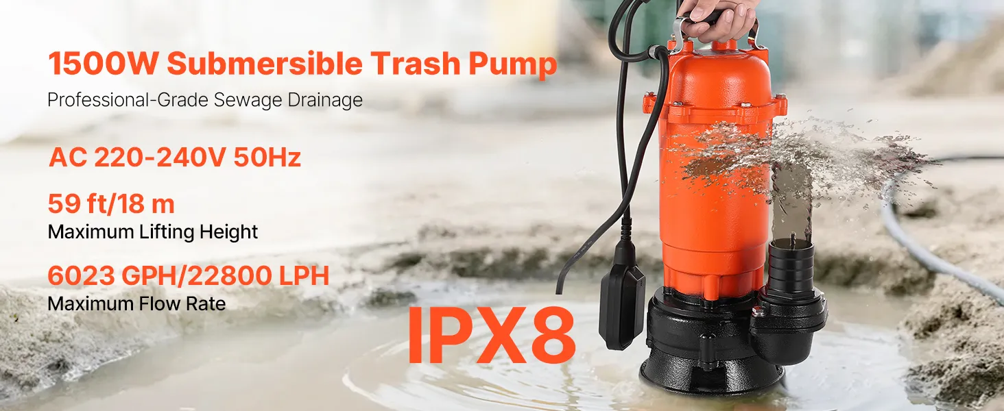 VEVOR 1500W Submersible Trash Pump, 22800 L/H, Cast Iron Submersible Sump Sewage Pump with Automatic Float Switch, 18M Max Lift, Draining Dirty Clean Water, for Pools, Garden, Pond, Flooded Areas
