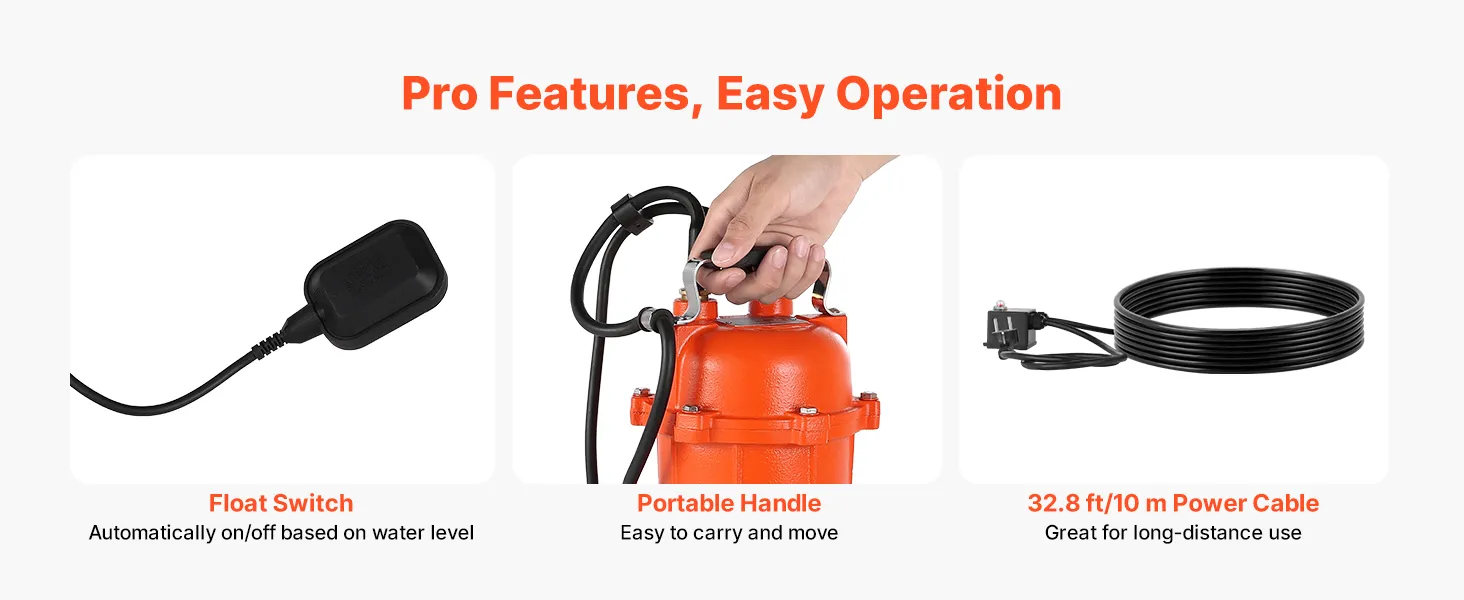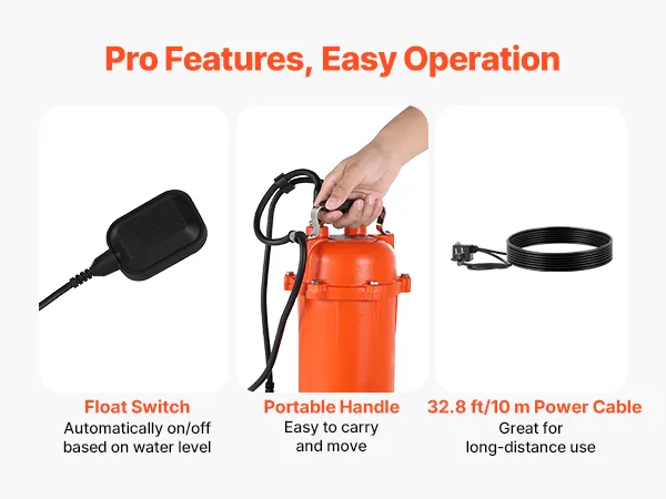 The float switch automatically turns on/off this submersible sewage pump based on water levels without constant monitoring. A portable handle makes transport effortless, while the long power cord provides flexible placement for hassle-free dirty water drainage.