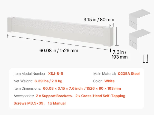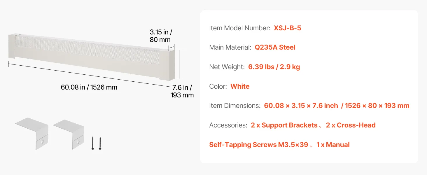 VEVOR Baseboard Heater Covers, Basic Series 1526 mm Standard Electric Heating Unit Front Cover for Home Improvement, Heavy-duty Steel, Easy Installation for Bedroom Replacing Old Cover, White